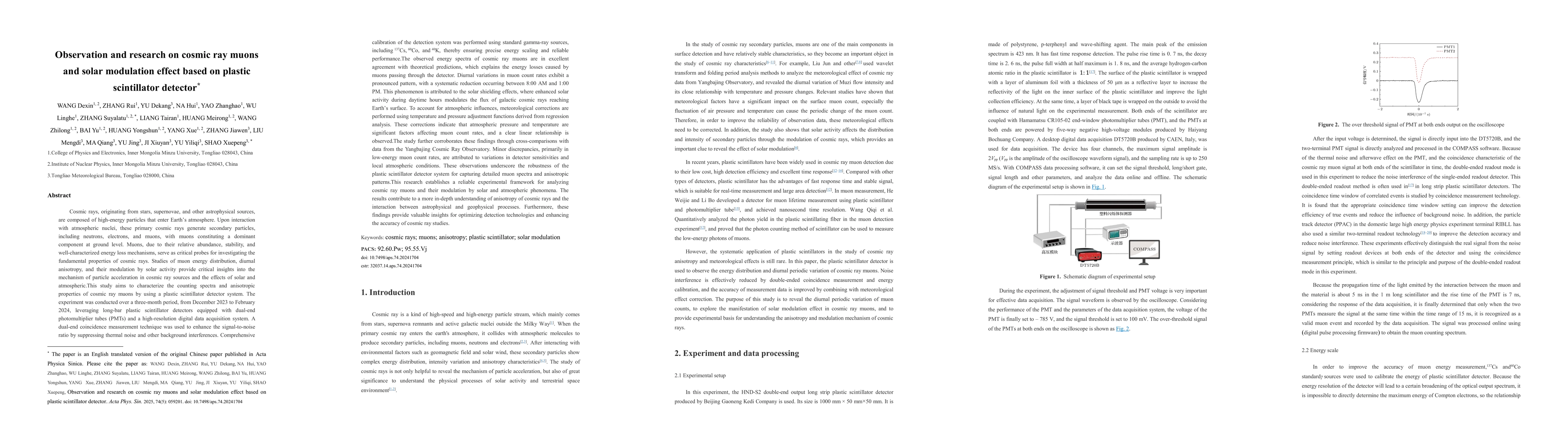 Cosmic rays, originating from stars, supernovae, and other astrophysical sources, are composed of high-energy particles that enter Earths atmosphere. Upon interaction with atmospheric nuclei, these primary cosmic rays generate secondary particles, including neutrons, electrons, and muons, with muons constituting a dominant component at ground level. Muons, due to their relative abundance, stability, and well-characterized energy loss mechanisms, serve as critical probes for investigating the fundamental properties of cosmic rays. Studies of muon energy distribution, diurnal anisotropy, and their modulation by solar activity provide critical insights into the mechanism of particle acceleration in cosmic ray sources and the effects of solar and atmospheric.This study aims to characterize the counting spectra and anisotropic properties of cosmic ray muons by using a plastic scintillator detector system. The experiment was conducted over a three-month period, from December 2023 to February 2024, leveraging long-bar plastic scintillator detectors equipped with dual-end photomultiplier tubes (PMTs) and a high-resolution digital data acquisition system. A dual-end coincidence measurement technique was used to enhance the signal-to-noise ratio by suppressing thermal noise and other background interferences. Diurnal variations in muon count rates exhibit a pronounced pattern, with a systematic reduction occurring between 8:00 AM and 1:00 PM. This phenomenon is attributed to the solar shielding effects, where enhanced solar activity during daytime hours modulates the flux of galactic cosmic rays reaching Earths surface. The study further corroborates these findings through cross-comparisons with data from the Yangbajing Cosmic Ray Observatory. These observations underscore the robustness of the plastic scintillator detector system for capturing detailed muon spectra and anisotropic patterns.