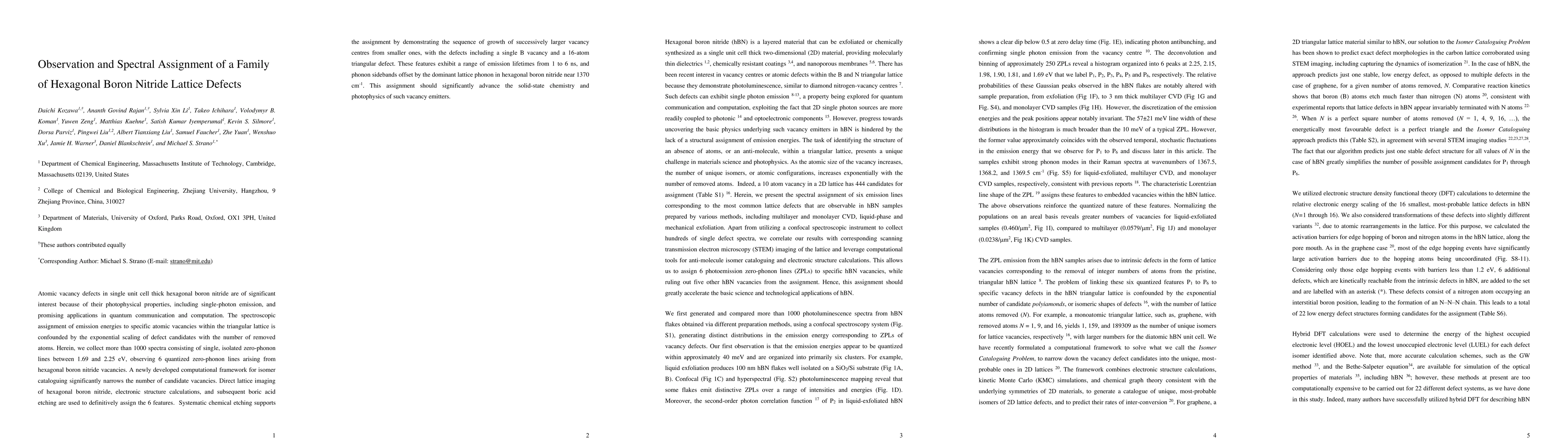 This paper reports the spectroscopic identification and assignment of six distinct zero-phonon lines in hexagonal boron nitride lattice defects, using advanced computational and imaging techniques. The study elucidates the photophysical properties of these defects, which hold promise for quantum communication and computation.