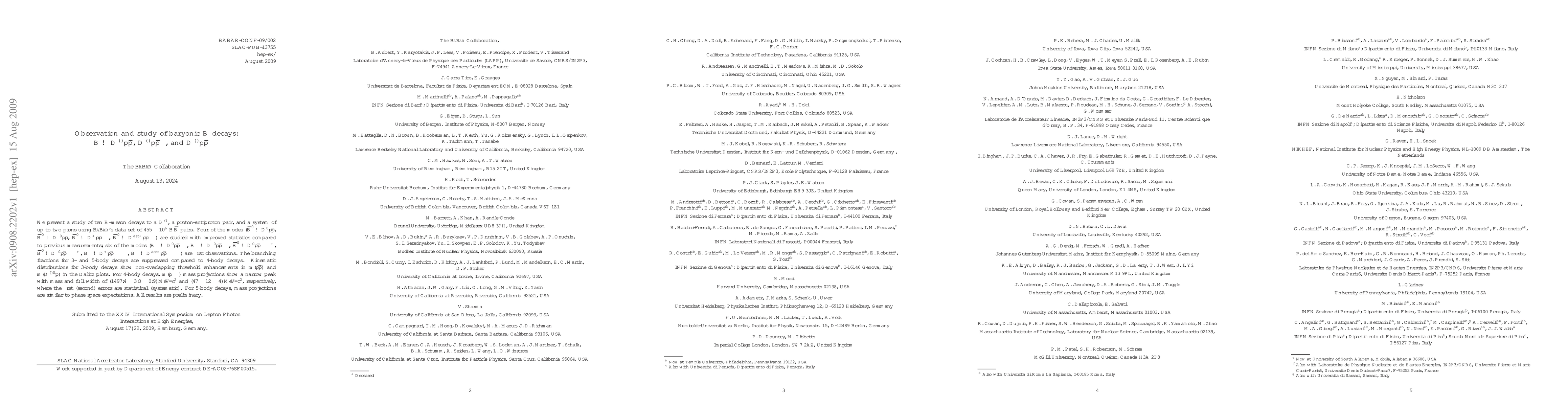 This study investigates ten baryonic B-meson decay modes using BaBar's data set, observing four modes with improved statistics and six new decay modes. The branching fractions for three- and five-body decays are found to be suppressed relative to four-body decays.