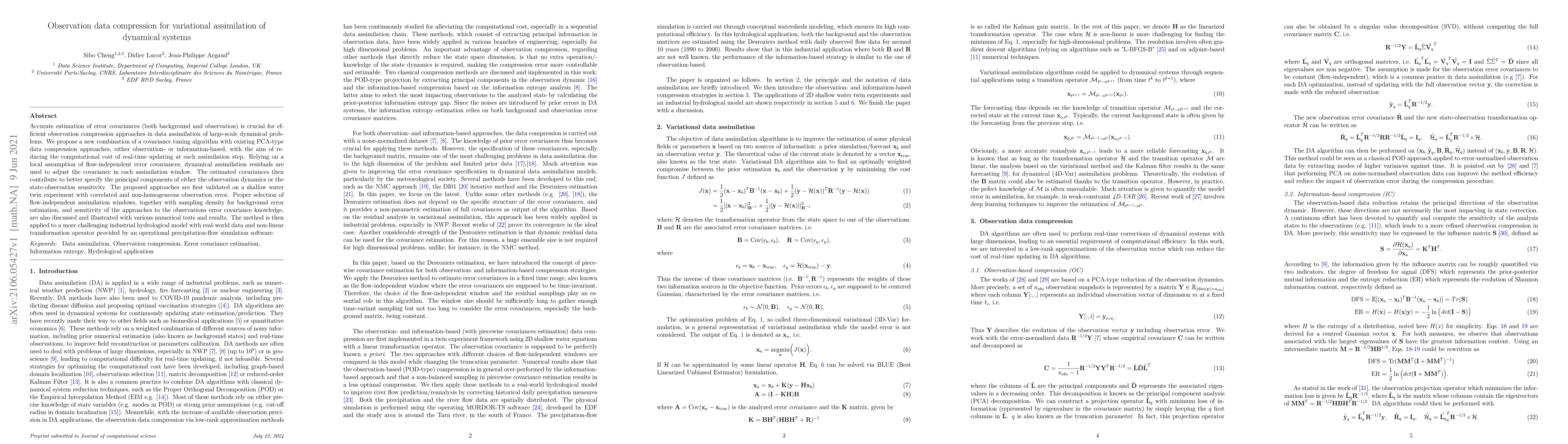 This paper proposes a new method for compressing observation data in variational assimilation of dynamical systems, combining covariance tuning with PCA-type compression to reduce computational costs. The method adjusts error covariances using assimilation residuals and is validated on both a shallow water twin experiment and an industrial hydrological model.