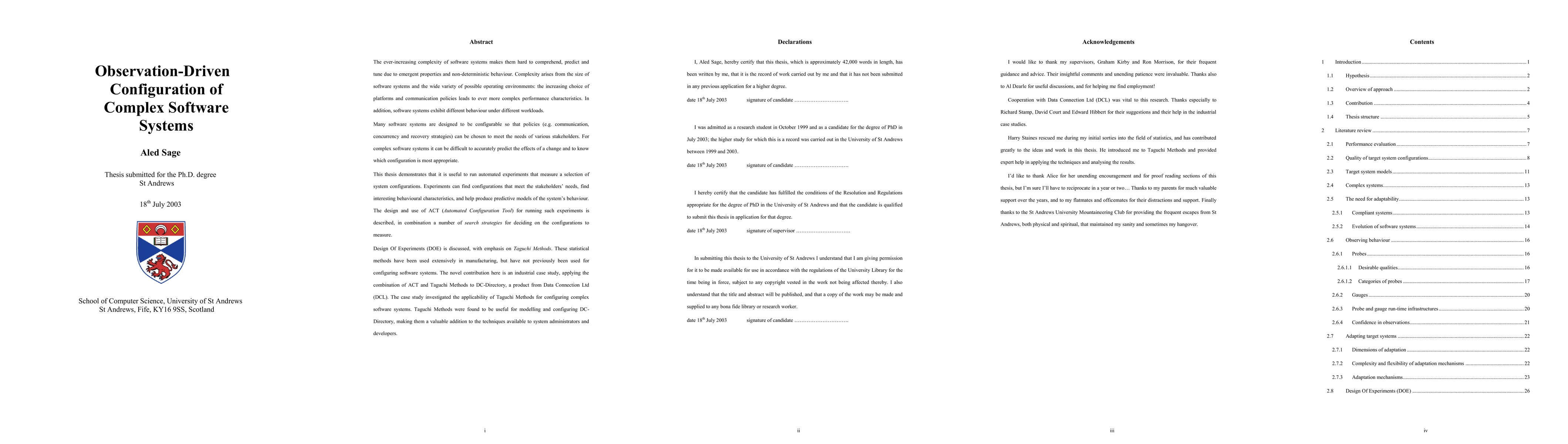 The ever-increasing complexity of software systems makes them hard to comprehend, predict and tune due to emergent properties and non-deterministic behaviour. Complexity arises from the size of software systems and the wide variety of possible operating environments: the increasing choice of platforms and communication policies leads to ever more complex performance characteristics. In addition, software systems exhibit different behaviour under different workloads. Many software systems are designed to be configurable so that policies can be chosen to meet the needs of various stakeholders. For complex software systems it can be difficult to accurately predict the effects of a change and to know which configuration is most appropriate. This thesis demonstrates that it is useful to run automated experiments that measure a selection of system configurations. Experiments can find configurations that meet the stakeholders' needs, find interesting behavioural characteristics, and help produce predictive models of the system's behaviour. The design and use of ACT (Automated Configuration Tool) for running such experiments is described, in combination a number of search strategies for deciding on the configurations to measure. Design Of Experiments (DOE) is discussed, with emphasis on Taguchi Methods. These statistical methods have been used extensively in manufacturing, but have not previously been used for configuring software systems. The novel contribution here is an industrial case study, applying the combination of ACT and Taguchi Methods to DC-Directory, a product from Data Connection Ltd (DCL). The case study investigated the applicability of Taguchi Methods for configuring complex software systems. Taguchi Methods were found to be useful for modelling and configuring DC- Directory, making them a valuable addition to the techniques available to system administrators and developers.