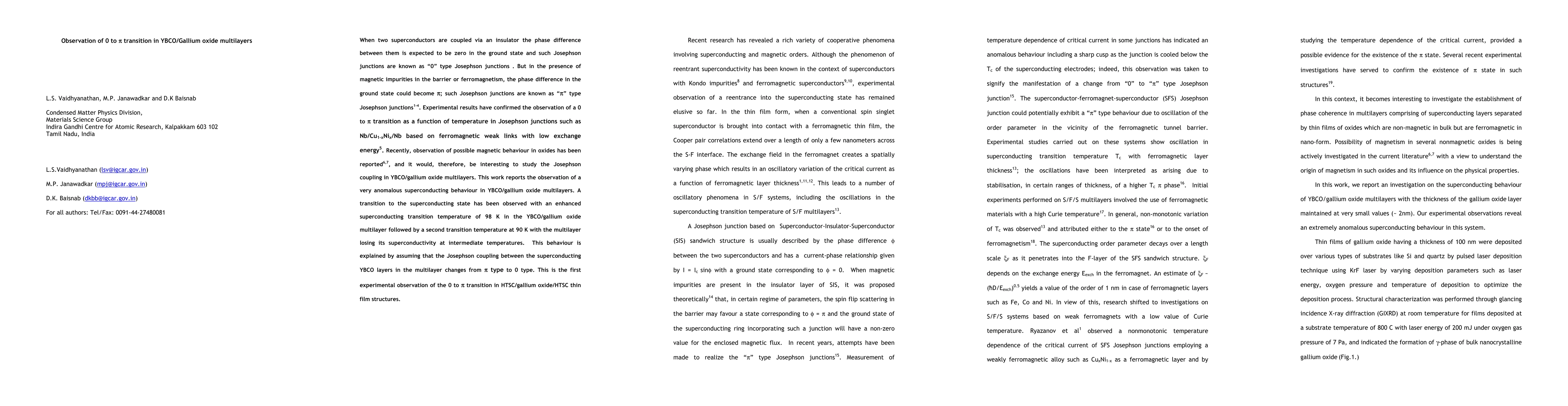 When two superconductors are coupled via an insulator the phase difference between them is expected to be zero in the ground state and such Josephson junctions are known as "0" type Josephson junctions . But in the presence of magnetic impurities in the barrier or ferromagnetism, the phase difference in the ground state could become pi; such Josephson junctions are known as "pi" type Josephson junctions1-4. Experimental results have confirmed the observation of a 0 to pi transition as a function of temperature in Josephson junctions such as Nb/Cu1-xNix/Nb based on ferromagnetic weak links with low exchange energy5. Recently, observation of possible magnetic behaviour in oxides has been reported6,7, and it would, therefore, be interesting to study the Josephson coupling in YBCO/gallium oxide multilayers. This work reports the observation of a very anomalous superconducting behaviour in YBCO/gallium oxide multilayers. A transition to the superconducting state has been observed with an enhanced superconducting transition temperature of 98 K in the YBCO/gallium oxide multilayer followed by a second transition temperature at 90 K with the multilayer losing its superconductivity at intermediate temperatures. This behaviour is explained by assuming that the Josephson coupling between the superconducting YBCO layers in the multilayer changes from pi type to 0 type. This is the first experimental observation of the 0 to pi transition in HTSC/gallium oxide/HTSC thin film structures.