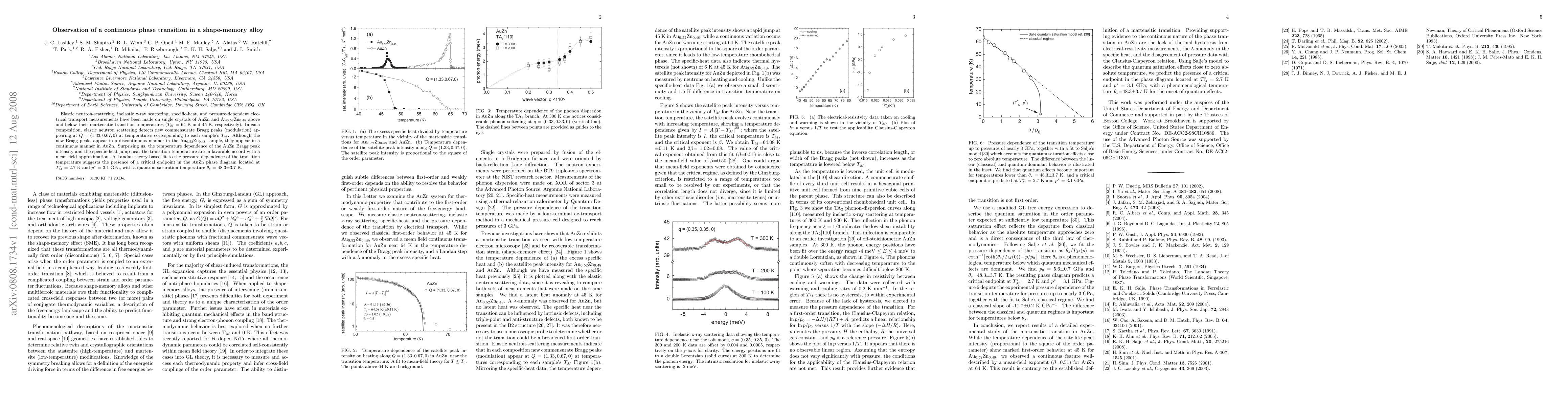 The study observes a continuous phase transition in AuZn shape-memory alloy using elastic neutron-scattering, inelastic x-ray scattering, specific-heat, and pressure-dependent electrical transport measurements. New Bragg peaks appear continuously at the martensitic transition temperature, with temperature dependence aligning with mean-field approximation. A critical endpoint is suggested in AuZn's phase diagram at T_M*=2.7K and p*=3.1GPa, indicating a quantum saturation temperature of 48.3K.