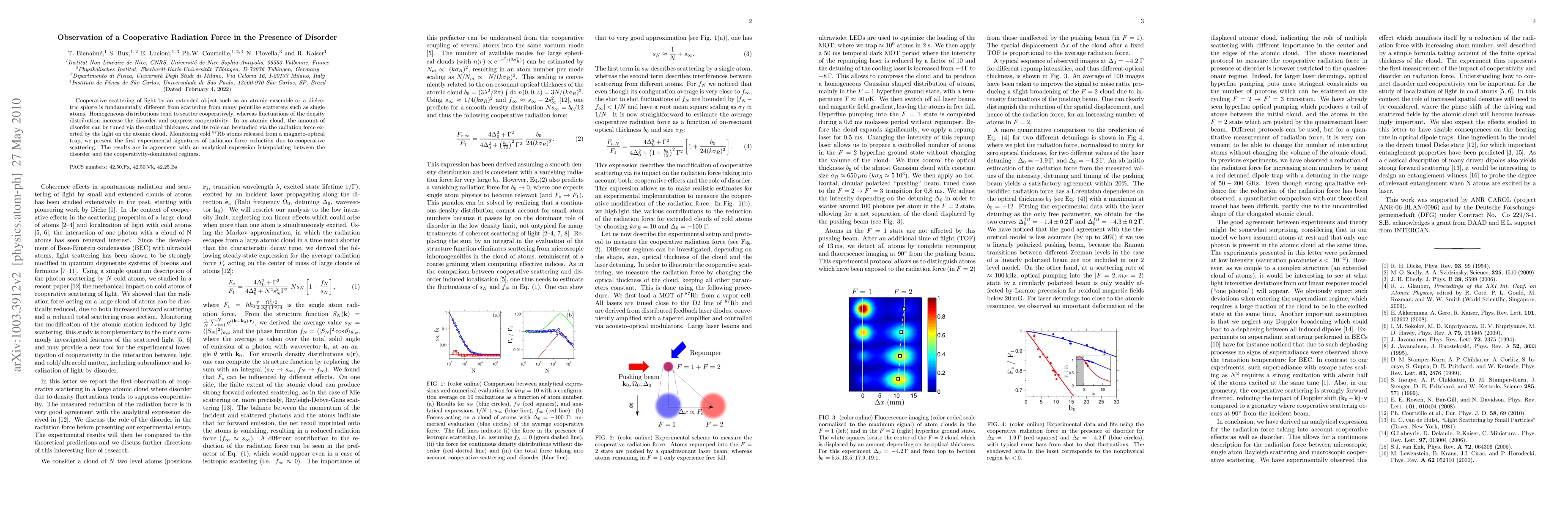 This paper reports the first experimental observation of reduced radiation force on an atomic cloud due to cooperative scattering, demonstrating how disorder diminishes this effect. The findings align with theoretical models predicting the transition between cooperative and disordered scattering regimes.