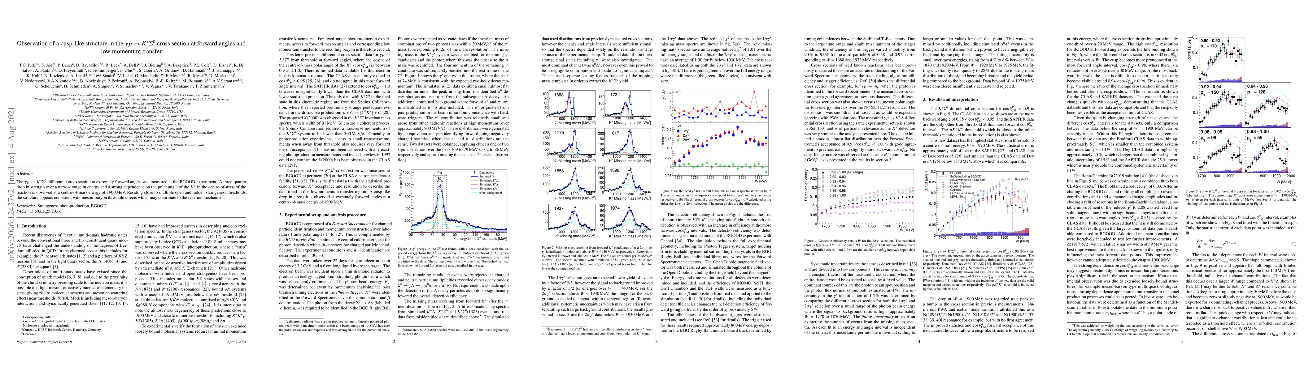 The BGOOD experiment observed a cusp-like structure in the $\gamma p \rightarrow K^+\Sigma^0$ differential cross section at forward angles and low momentum transfer, indicating a three-quarter drop in strength over a narrow energy range. This structure, near multiple strangeness thresholds, suggests meson-baryon threshold effects may influence the reaction mechanism.