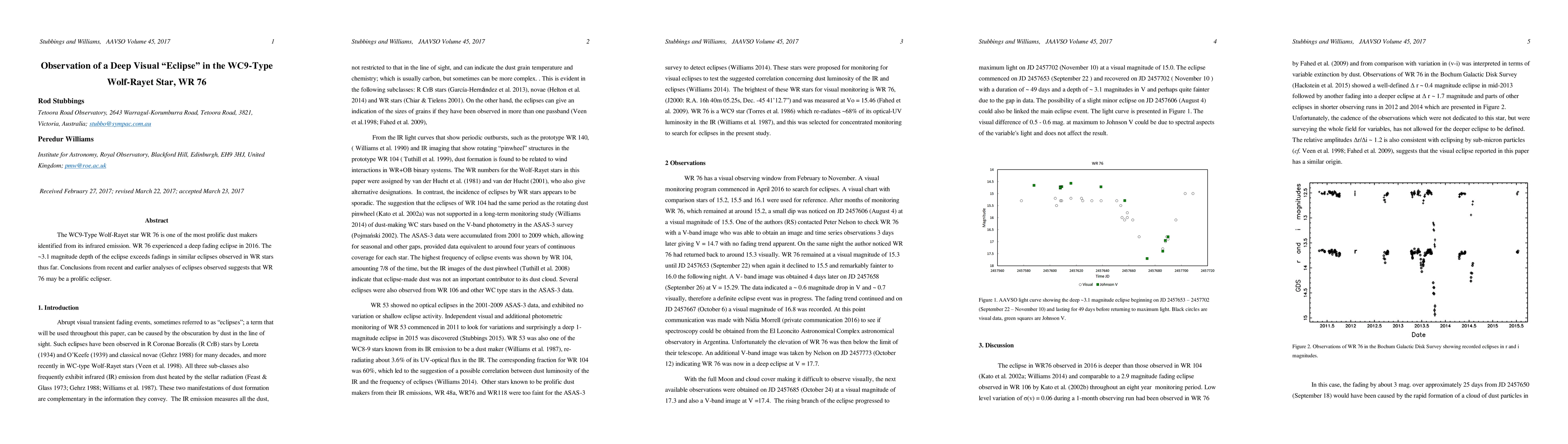 The WC9-Type Wolf-Rayet star WR 76 is one of the most prolific dust makers identified from its infrared emission. WR 76 experienced a deep fading eclipse in 2016. The ~3.1 magnitude depth of the eclipse exceeds fadings in similar eclipses observed in WR stars thus far. Conclusions from recent and earlier analyses of eclipses observed suggests that WR 76 may be a prolific eclipser.