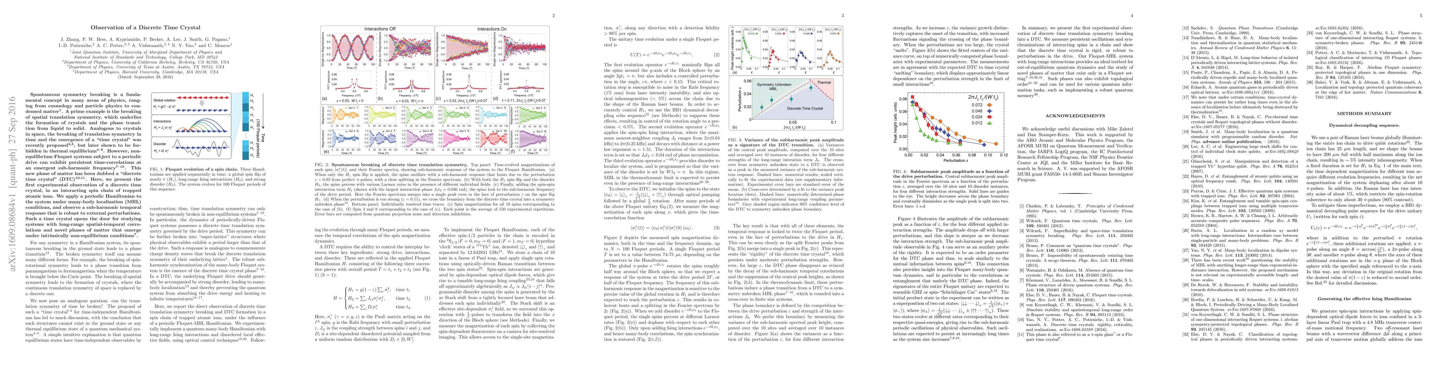 Spontaneous symmetry breaking is a fundamental concept in many areas of physics, ranging from cosmology and particle physics to condensed matter. A prime example is the breaking of spatial translation symmetry, which underlies the formation of crystals and the phase transition from liquid to solid. Analogous to crystals in space, the breaking of translation symmetry in time and the emergence of a "time crystal" was recently proposed, but later shown to be forbidden in thermal equilibrium. However, non-equilibrium Floquet systems subject to a periodic drive can exhibit persistent time-correlations at an emergent sub-harmonic frequency. This new phase of matter has been dubbed a "discrete time crystal" (DTC). Here, we present the first experimental observation of a discrete time crystal, in an interacting spin chain of trapped atomic ions. We apply a periodic Hamiltonian to the system under many-body localization (MBL) conditions, and observe a sub-harmonic temporal response that is robust to external perturbations. Such a time crystal opens the door for studying systems with long-range spatial-temporal correlations and novel phases of matter that emerge under intrinsically non-equilibrium conditions.