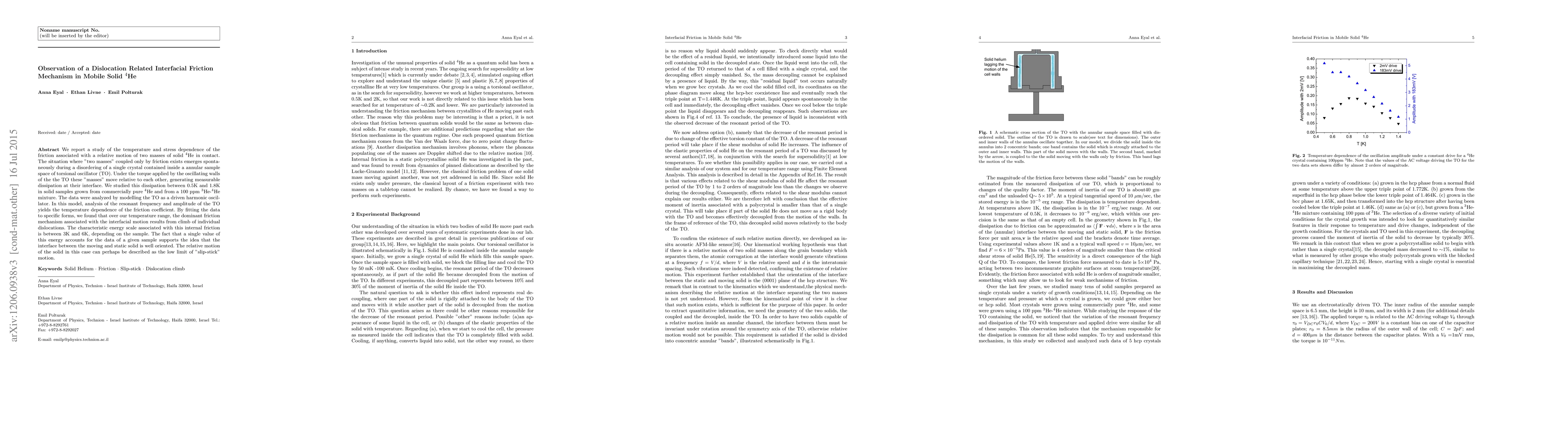 We report a study of the temperature and stress dependence of the friction associated with a relative motion of two masses of solid $^4$He in contact. The situation where "two masses" coupled only by friction exists emerges spontaneously during a disordering of a single crystal contained inside a annular sample space of torsional oscillator (TO). Under the torque applied by the oscillating walls of the the TO these "masses" move relative to each other, generating measurable dissipation at their interface. We studied this dissipation between 0.5K and 1.8K in solid samples grown from commercially pure $^4$He and from a 100 ppm $^3$He-$^4$He mixture. The data were analyzed by modelling the TO as a driven harmonic oscillator. In this model, analysis of the resonant frequency and amplitude of the TO yields the temperature dependence of the friction coefficient. By fitting the data to specific forms, we found that over our temperature range, the dominant friction mechanism associated with the interfacial motion results from climb of individual dislocations. The characteristic energy scale associated with this internal friction is between 3K and 6K, depending on the sample. The fact that a single value of this energy accounts for the data of a given sample supports the idea that the interface between the moving and static solid is well oriented. The relative motion of the solid in this case can perhaps be described as the low limit of "slip-stick" motion.