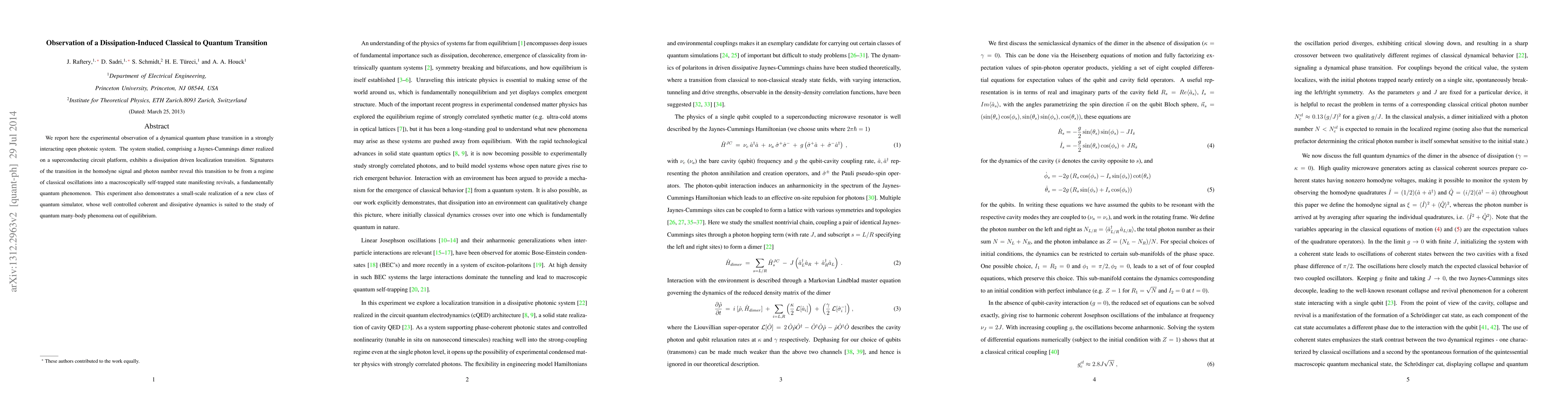 This paper reports the experimental observation of a dissipation-induced classical to quantum transition in a Jaynes-Cummings dimer on a superconducting circuit. The transition manifests as a shift from classical oscillations to a macroscopically self-trapped state with quantum revivals, showcasing a new quantum simulator for studying out-of-equilibrium quantum many-body phenomena.