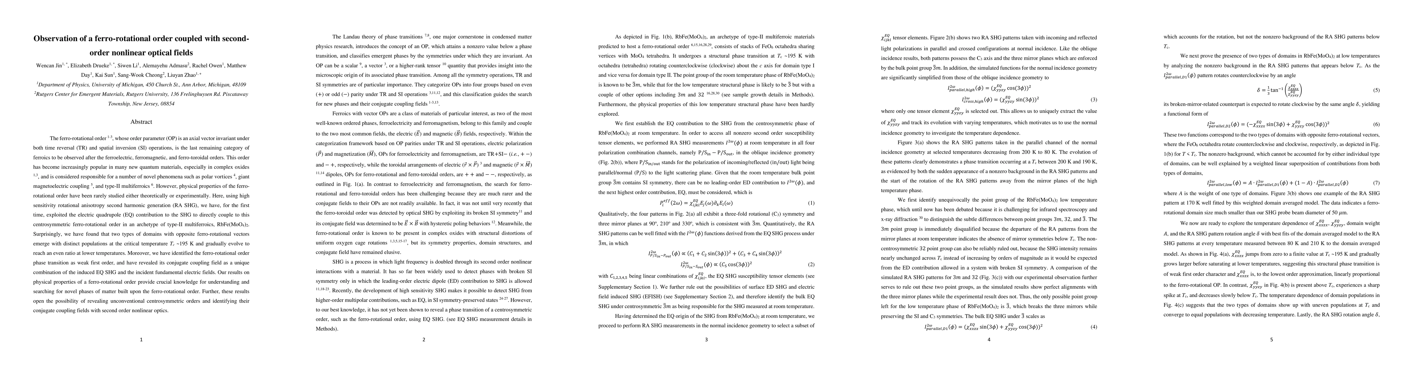 Researchers observed a ferro-rotational order in a type-II multiferroic material for the first time using high-sensitivity rotational anisotropy second harmonic generation. The study revealed distinct domains with opposite ferro-rotational vectors and their phase transition at 195 K, opening possibilities for understanding novel phases of matter.