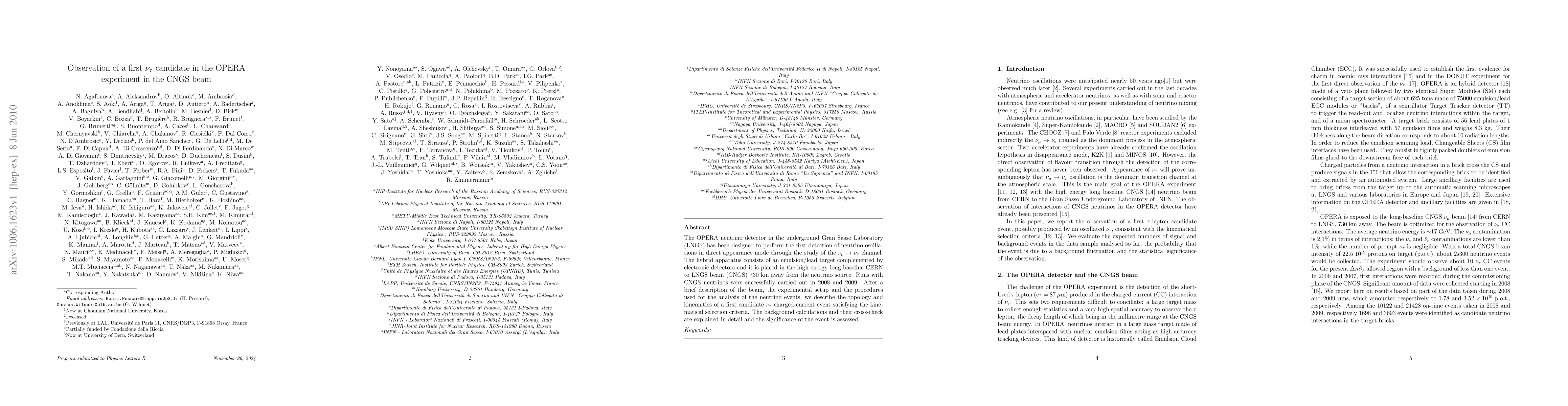 The OPERA experiment successfully observed a first candidate for a tau neutrino ($\nu_\tau$) in the CNGS beam, marking a significant step in the detection of neutrino oscillations. The hybrid detector setup in the Gran Sasso Laboratory analyzed data from 2008 and 2009, confirming the event's topology and kinematics while rigorously assessing background and significance.