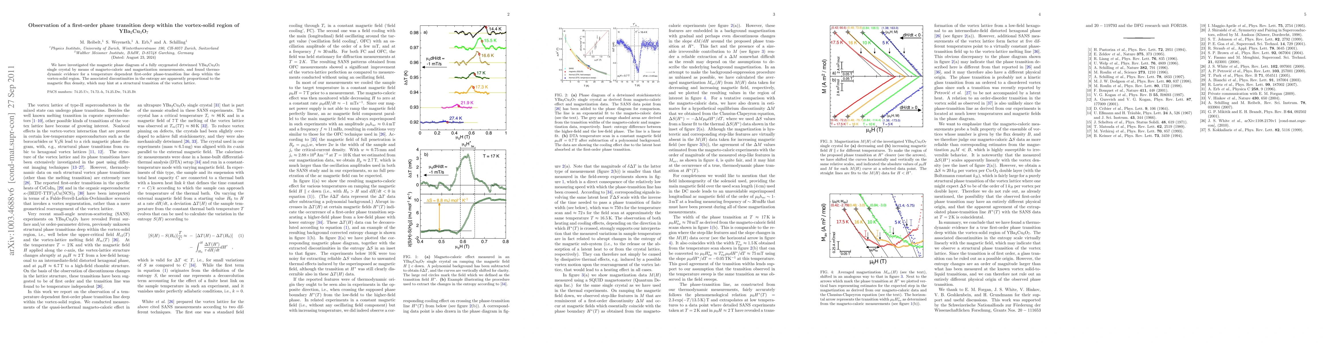 Researchers observed a temperature-dependent phase transition in YBa2Cu3O7, characterized by discontinuities in entropy proportional to magnetic flux density, suggesting a structural transition of the vortex lattice.