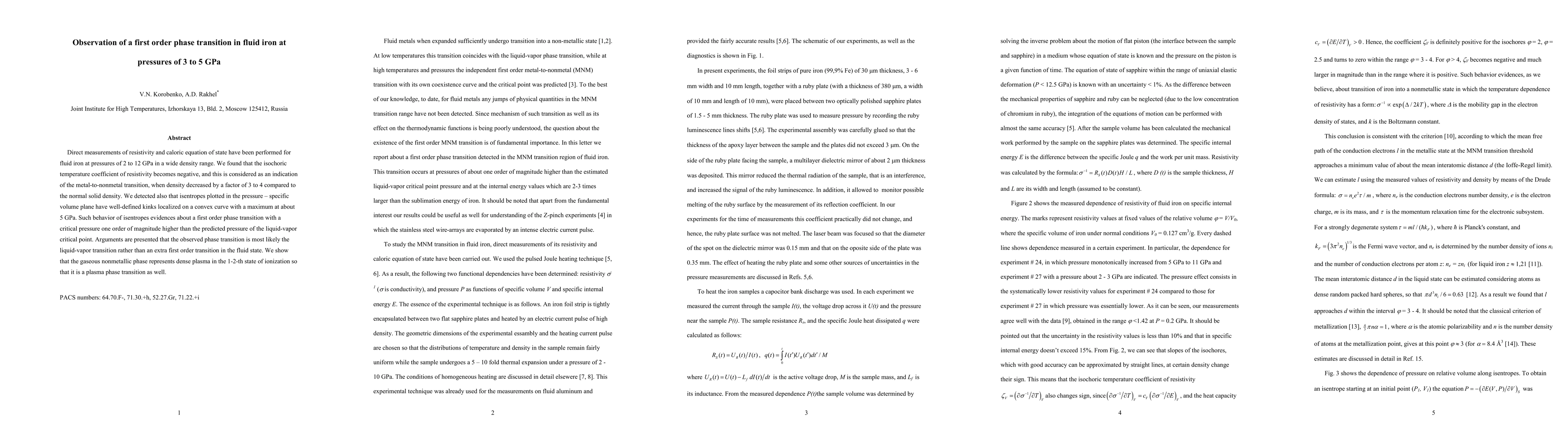 This study observes a first-order phase transition in fluid iron at pressures of 3 to 5 GPa, evidenced by a negative isochoric temperature coefficient of resistivity and kinks in isentropes. The transition likely represents a liquid-vapor transition into a dense plasma phase.