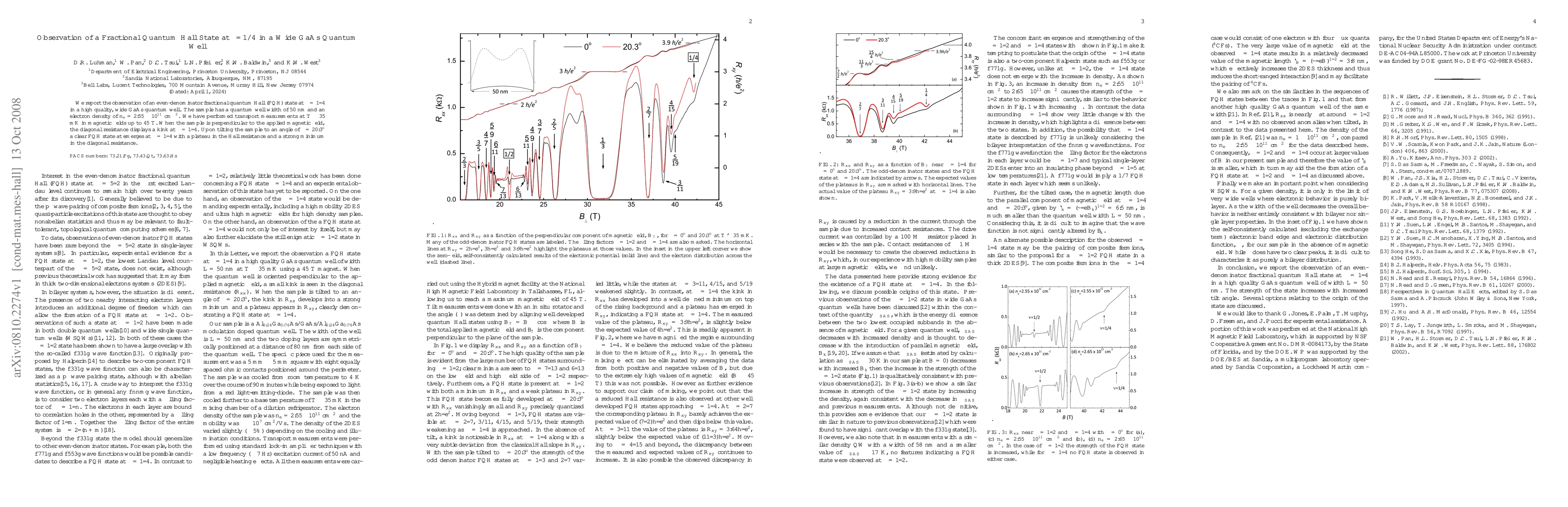 This research reports the observation of a fractional quantum Hall state at $\nu=1/4$ in a high-quality, wide GaAs quantum well, characterized by transport measurements showing a kink at $\nu=1/4$ and a clear plateau in Hall resistance upon sample tilting.