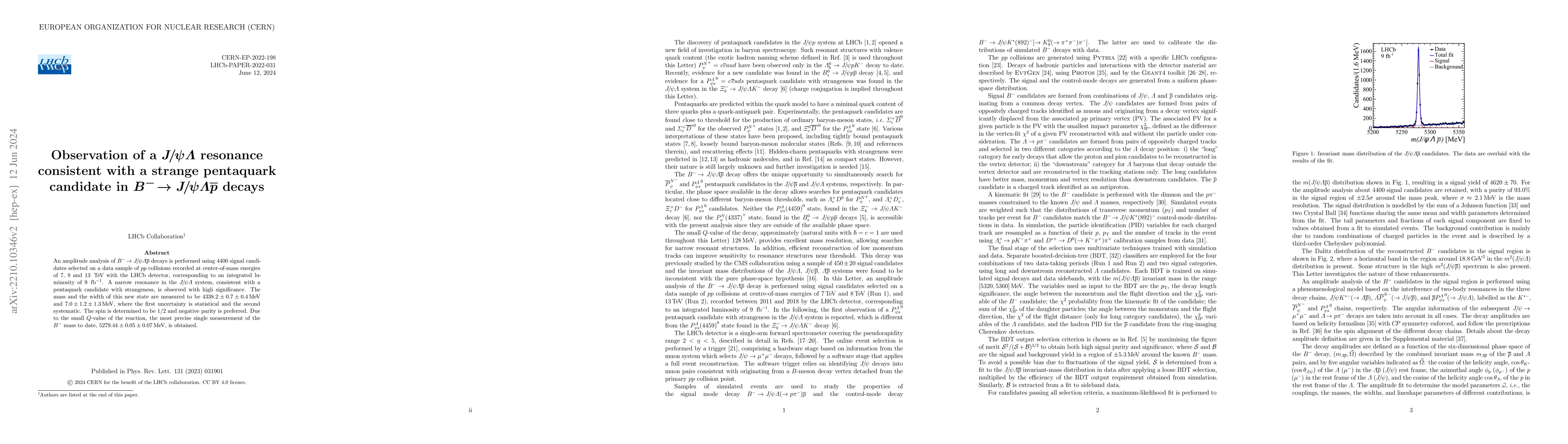 The LHCb experiment observed a narrow resonance in $B^-\to J/\psi\Lambda\bar{p}$ decays, consistent with a strange pentaquark candidate, with a mass of $4338.2\pm 0.7\pm 0.4$ MeV and a width of $7.0\pm1.2\pm1.3$ MeV. The resonance has a spin of $1/2$ and negative parity.