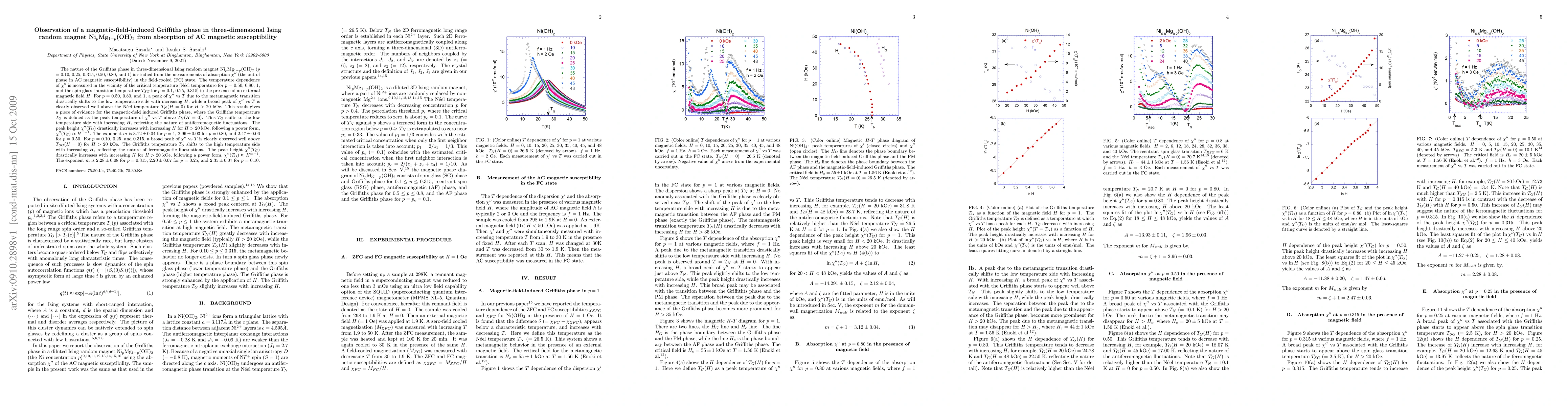 The research identifies a magnetic-field-induced Griffiths phase in the three-dimensional Ising random magnet Ni_pMg_{1-p}(OH)_2. This was achieved by examining the absorption (out-of-phase component of AC magnetic susceptibility) in the field-cooled state near critical temperatures, revealing a broad peak in absorption vs temperature above the critical temperature for various magnetic field strengths.