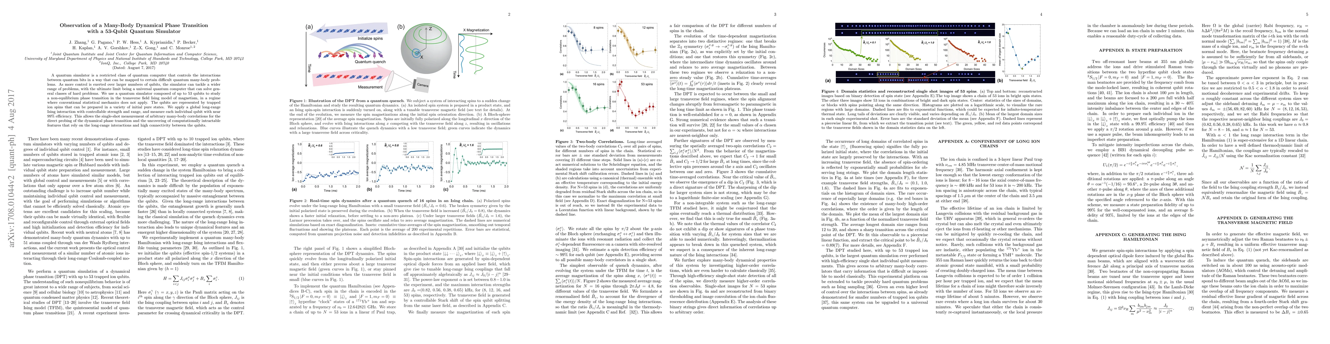 A quantum simulator is a restricted class of quantum computer that controls the interactions between quantum bits in a way that can be mapped to certain difficult quantum many-body problems. As more control is exerted over larger numbers of qubits, the simulator can tackle a wider range of problems, with the ultimate limit being a universal quantum computer that can solve general classes of hard problems. We use a quantum simulator composed of up to 53 qubits to study a non-equilibrium phase transition in the transverse field Ising model of magnetism, in a regime where conventional statistical mechanics does not apply. The qubits are represented by trapped ion spins that can be prepared in a variety of initial pure states. We apply a global long-range Ising interaction with controllable strength and range, and measure each individual qubit with near 99% efficiency. This allows the single-shot measurement of arbitrary many-body correlations for the direct probing of the dynamical phase transition and the uncovering of computationally intractable features that rely on the long-range interactions and high connectivity between the qubits.