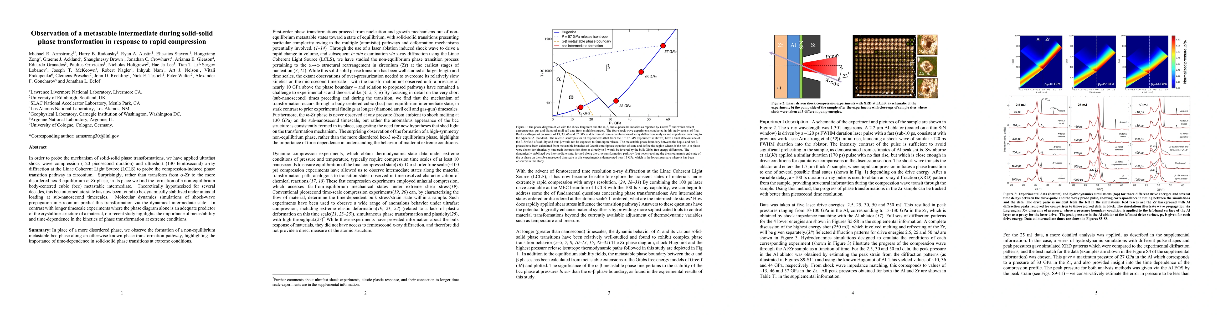 This study reveals the formation of a non-equilibrium body-centered cubic metastable intermediate during the rapid compression-induced phase transformation in zirconium, challenging traditional equilibrium phase diagrams. The discovery, made using ultrafast shock waves and femtosecond x-ray diffraction, underscores the significance of metastability and time-dependence in phase transformation kinetics under extreme conditions.