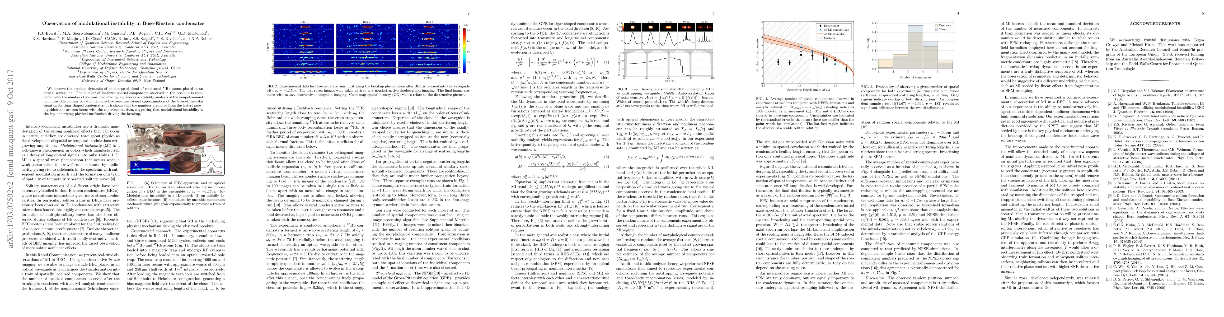 This study observes the breakup dynamics of a Bose-Einstein condensate in an optical waveguide, revealing that modulational instability drives the formation of localized spatial components. Experimental results match predictions from a plane-wave stability analysis of the nonpolynomial nonlinear Schrödinger equation, confirming the role of modulational instability in the breakup process.