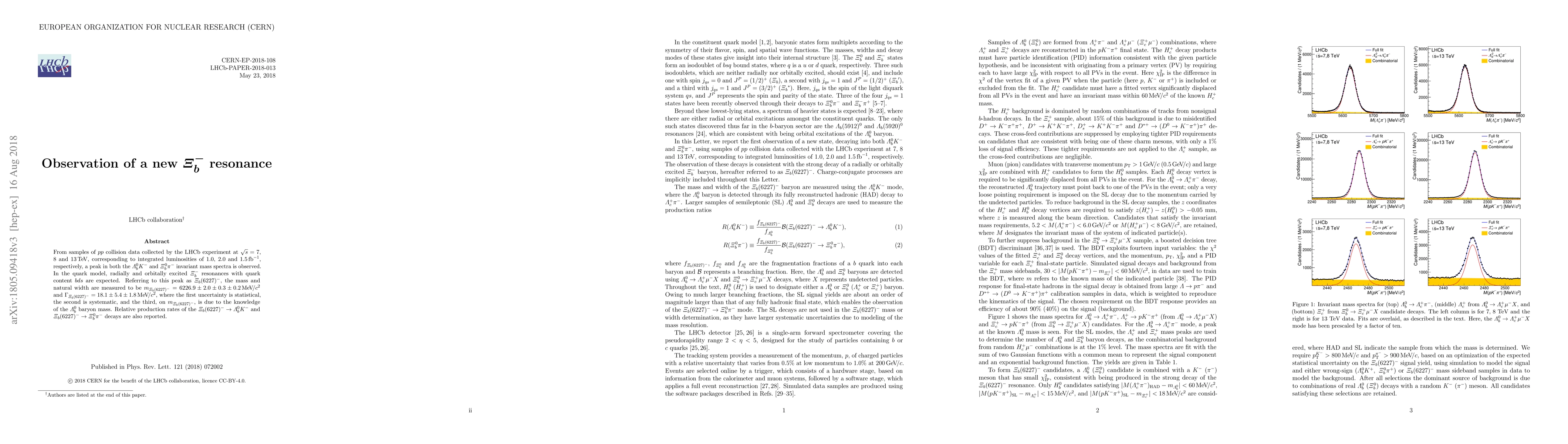 The LHCb experiment observed a new $\Xi_b^-$ resonance, named $\Xi_b(6227)^-$, with a mass of $6226.9\pm2.0\pm0.3\pm0.2$ MeV/$c^2$ and a natural width of $18.1\pm5.4\pm1.8$ MeV/$c^2$, from $pp$ collision data at $\sqrt{s}=7$, $8$, and $13$ TeV. The relative production rates of its decays were also determined.