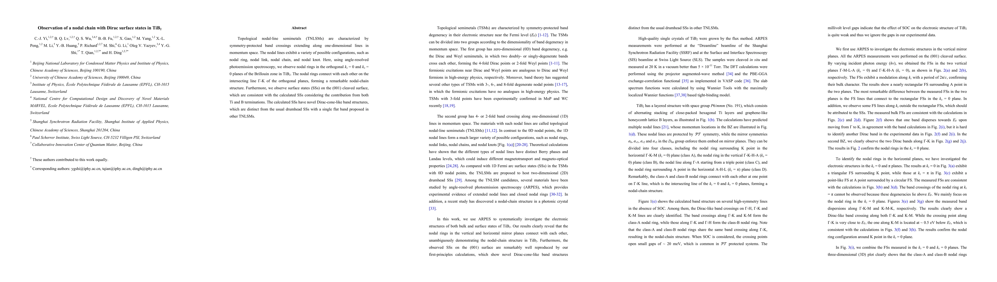 This research paper discovers a nodal chain with Dirac surface states in TiB2 using angle-resolved photoemission spectroscopy, revealing a novel topological phase with distinct band structures.