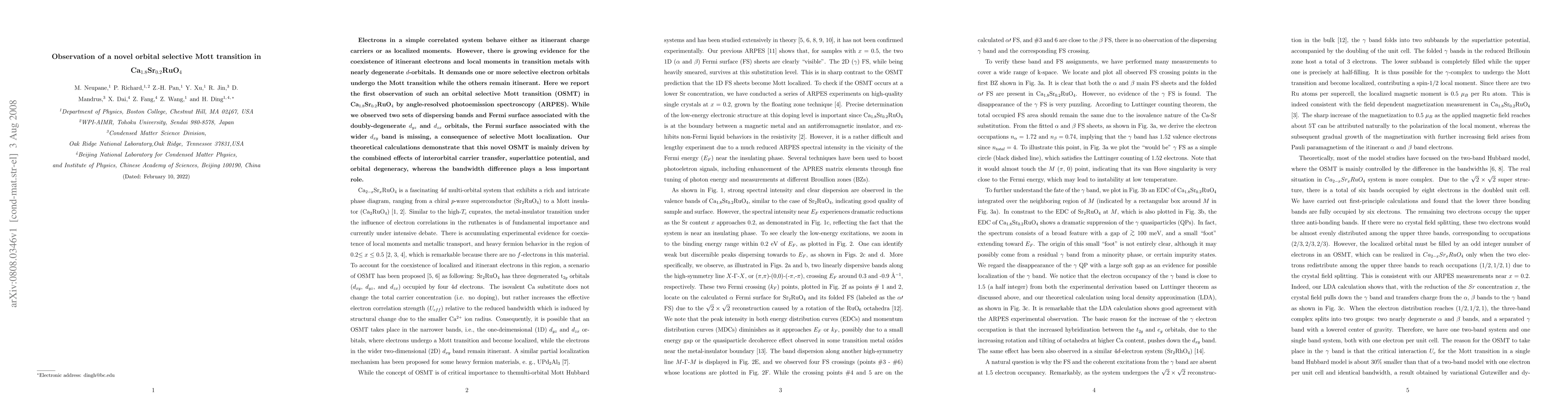 ARPES measurements were performed to study the electronic structure of Ca1.8Sr0.2RuO4
