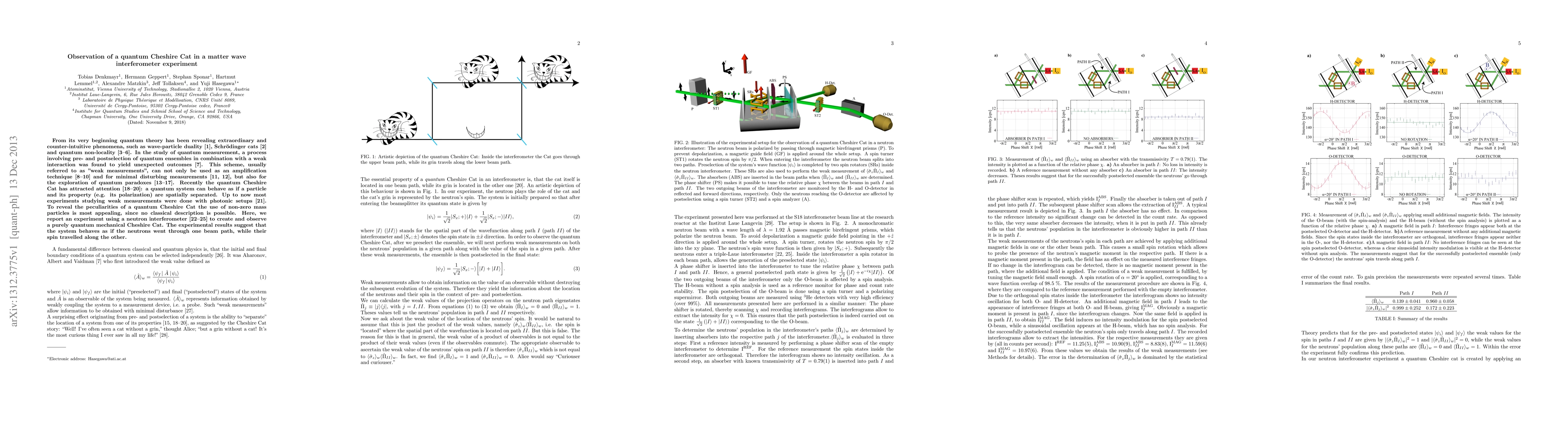 This paper reports an experiment using a neutron interferometer to observe a quantum Cheshire Cat, where a neutron's spin appears to travel along a separate path from the neutron itself, demonstrating the separation of particle and property in quantum mechanics. The findings support the quantum phenomenon in non-zero mass particles, extending the concept beyond photonic systems.