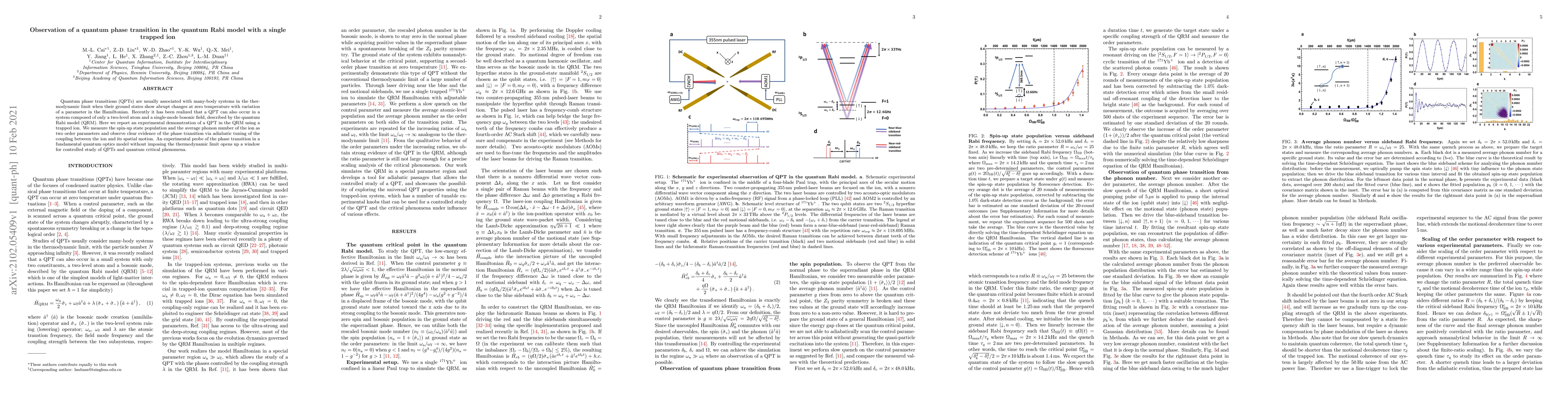 This paper reports the first experimental observation of a quantum phase transition in the quantum Rabi model using a single trapped ion, demonstrating the transition through changes in the ion's spin-up state population and phonon number during a slow quench of coupling. This study provides a new approach to studying quantum critical phenomena without the need for large, many-body systems.