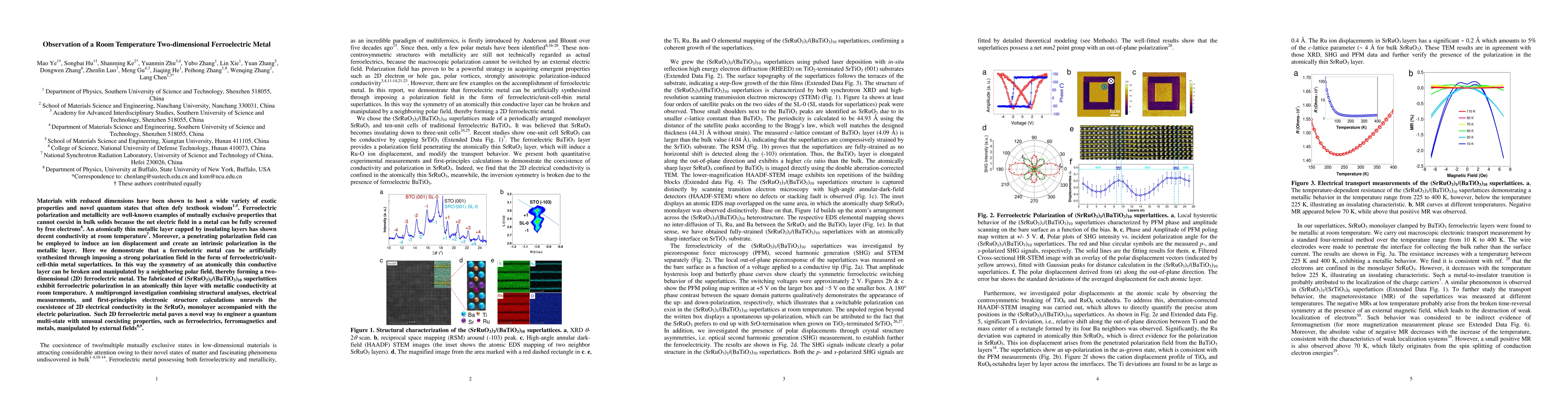 This paper reports the synthesis of a two-dimensional ferroelectric metal through the creation of superlattices combining SrRuO3 and BaTiO3. The study demonstrates that a strong polarization field can induce ferroelectric polarization in an atomically thin metallic layer, resulting in a material that exhibits both metallic conductivity and ferroelectric properties at room temperature.
