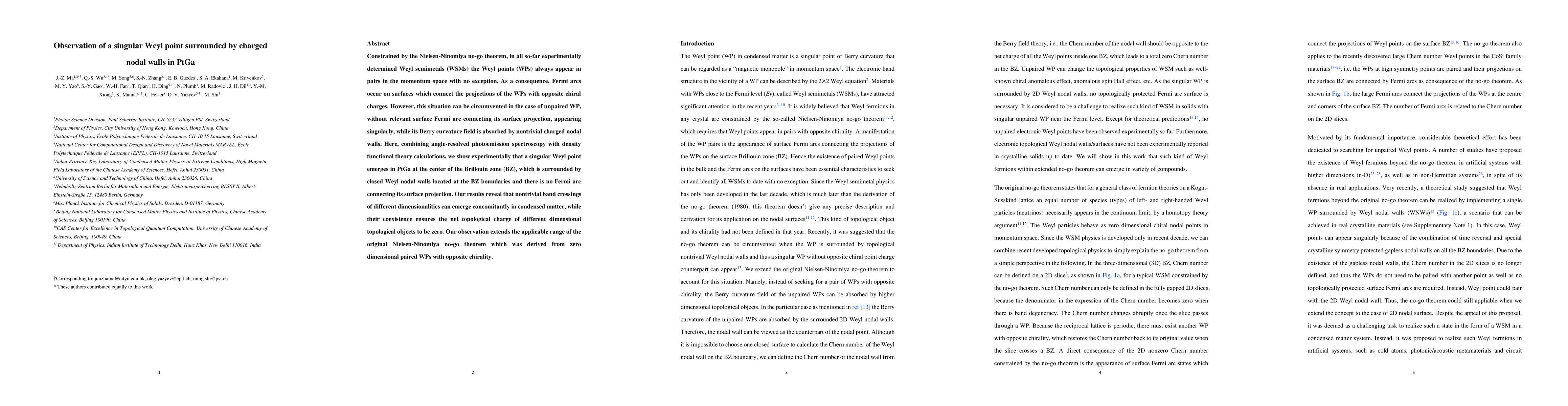 This research paper reports the first observation of a singular Weyl point in PtGa, surrounded by charged nodal walls without a connecting Fermi arc, challenging the Nielsen-Ninomiya theorem which dictates Weyl points must appear in pairs in Weyl semimetals. The findings, achieved through angle-resolved photoemission and density functional theory, demonstrate the coexistence of different dimensional topological objects in condensed matter.