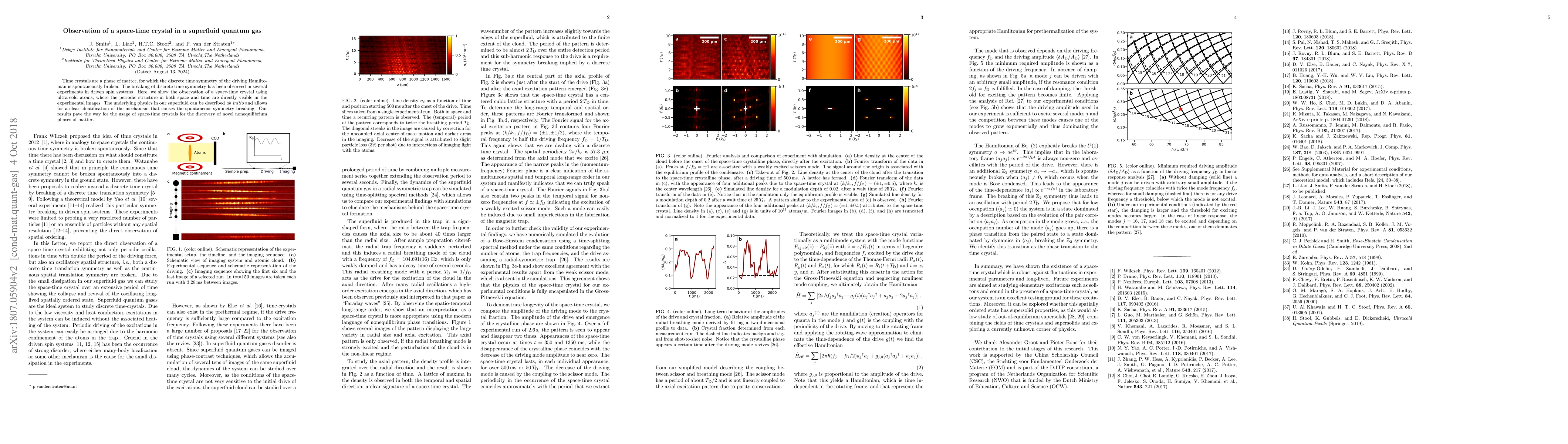 Time crystals are a phase of matter, for which the discrete time symmetry of the driving Hamiltonian is spontaneously broken. The breaking of discrete time symmetry has been observed in several experiments in driven spin systems. Here, we show the observation of a space-time crystal using ultra-cold atoms, where the periodic structure in both space and time are directly visible in the experimental images. The underlying physics in our superfluid can be described ab initio and allows for a clear identification of the mechanism that causes the spontaneous symmetry breaking. Our results pave the way for the usage of space-time crystals for the discovery of novel nonequilibrium phases of matter.