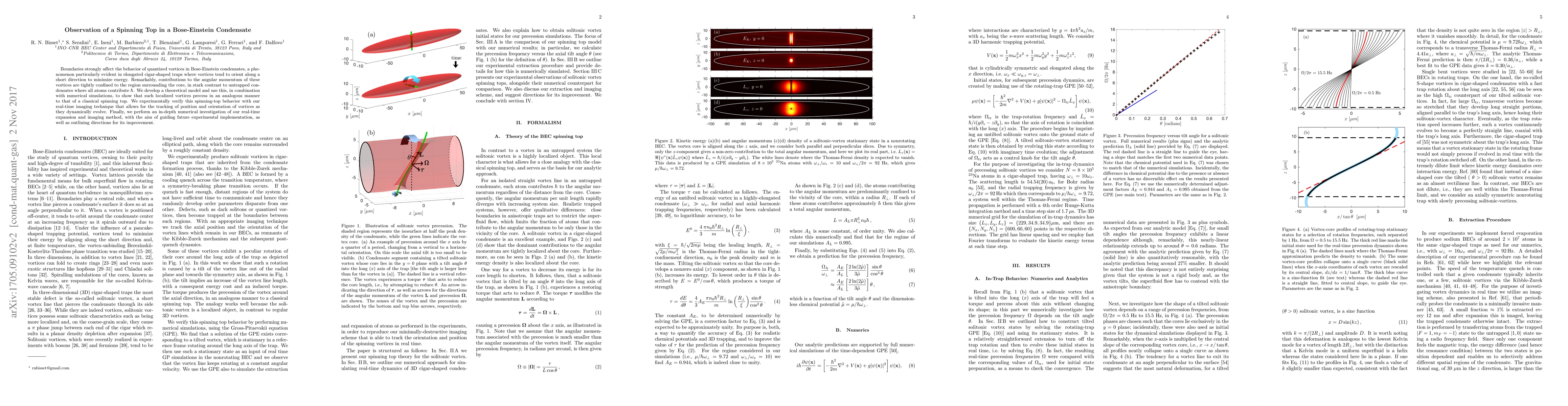 Boundaries strongly affect the behavior of quantized vortices in Bose-Einstein condensates, a phenomenon particularly evident in elongated cigar-shaped traps where vortices tend to orient along a short direction to minimize energy. Remarkably, contributions to the angular momentum of these vortices are tightly confined to the region surrounding the core, in stark contrast to untrapped condensates where all atoms contribute $\hbar$. We develop a theoretical model and use this, in combination with numerical simulations, to show that such localized vortices precess in an analogous manner to that of a classical spinning top. We experimentally verify this spinning-top behavior with our real-time imaging technique that allows for the tracking of position and orientation of vortices as they dynamically evolve. Finally, we perform an in-depth numerical investigation of our real-time expansion and imaging method, with the aim of guiding future experimental implementation, as well as outlining directions for its improvement.