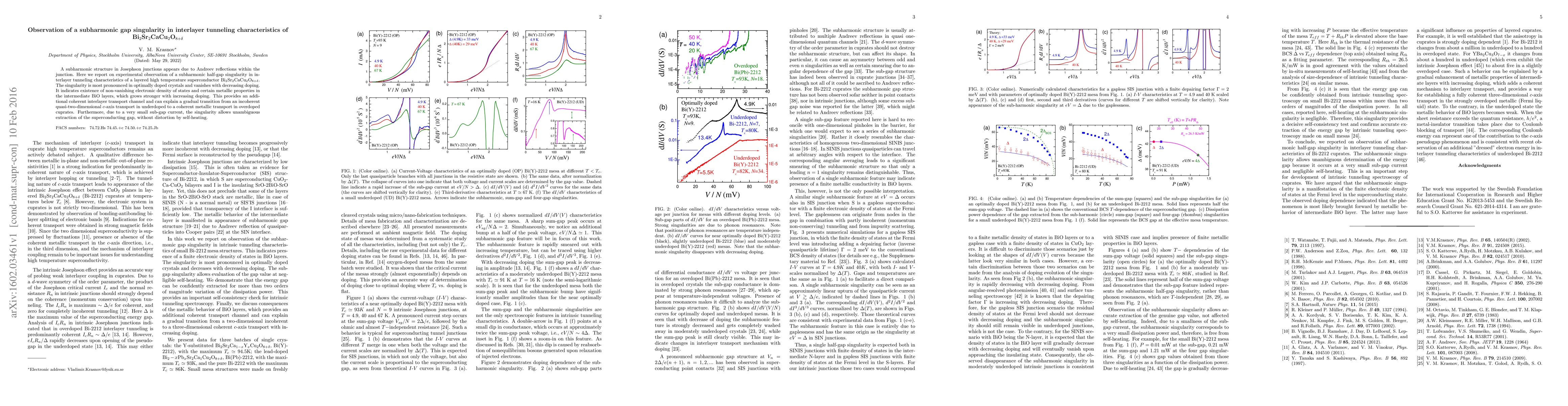 A subharmonic structure in Josephson junctions appears due to Andreev reflections within the junction. Here we report on experimental observation of a subharmonic half-gap singularity in interlayer tunneling characteristics of a layered high temperature superconductor Bi2Sr2CaCu2O8+d. The singularity is most pronounced in optimally doped crystals and vanishes with decreasing doping. It indicates existence of non-vanishing electronic density of states and certain metallic properties in the intermediate BiO layers, which grows stronger with increasing doping. This provides an additional coherent interlayer transport channel and can explain a gradual transition from an incoherent quasi-two-dimensional $c$-axis transport in underdoped to a coherent metallic transport in overdoped cuprates. Furthermore, due to a very small sub-gap current, the singularity allows unambiguous extraction of the superconducting gap, without distortion by self-heating.