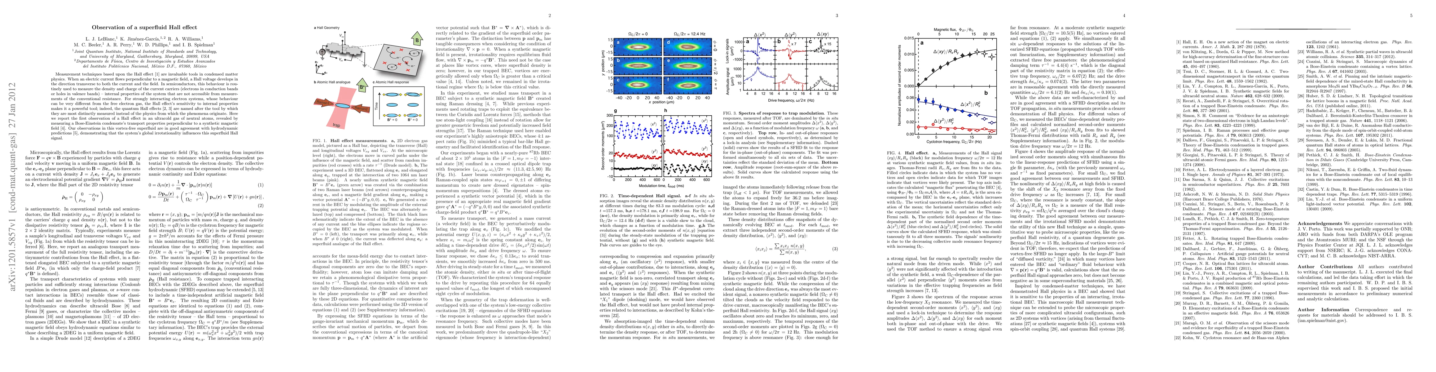 Measurement techniques based upon the Hall effect are invaluable tools in condensed matter physics. When an electric current flows perpendicular to a magnetic field, a Hall voltage develops in the direction transverse to both the current and the field. In semiconductors, this behaviour is routinely used to measure the density and charge of the current carriers (electrons in conduction bands or holes in valence bands) -- internal properties of the system that are not accessible from measurements of the conventional resistance. For strongly interacting electron systems, whose behaviour can be very different from the free electron gas, the Hall effect's sensitivity to internal properties makes it a powerful tool; indeed, the quantum Hall effects are named after the tool by which they are most distinctly measured instead of the physics from which the phenomena originate. Here we report the first observation of a Hall effect in an ultracold gas of neutral atoms, revealed by measuring a Bose-Einstein condensate's transport properties perpendicular to a synthetic magnetic field. Our observations in this vortex-free superfluid are in good agreement with hydrodynamic predictions, demonstrating that the system's global irrotationality influences this superfluid Hall signal.
