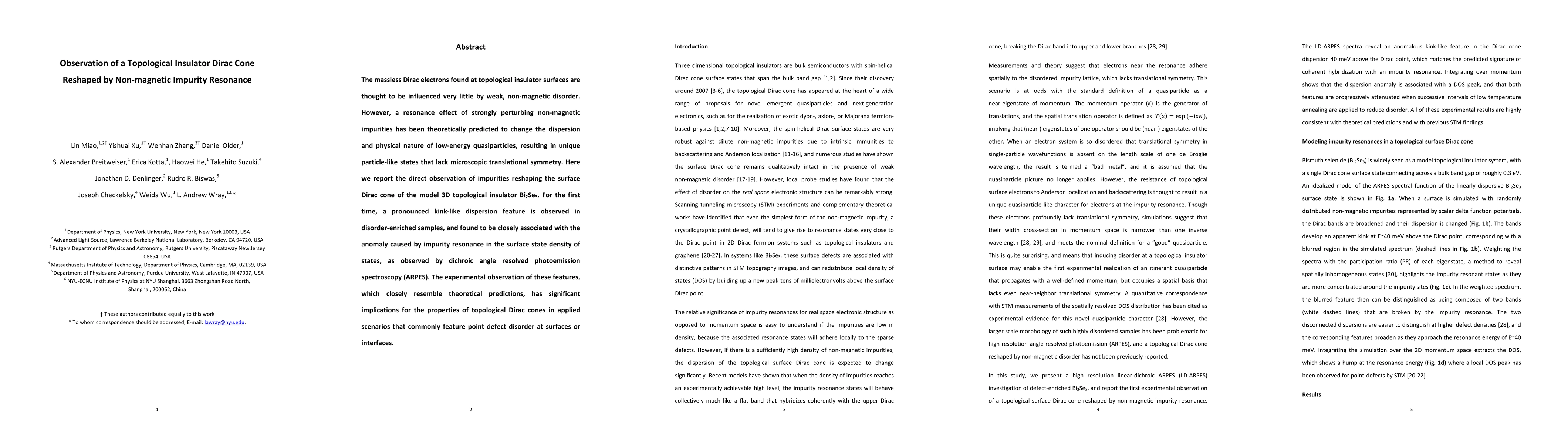 The massless Dirac electrons found at topological insulator surfaces are thought to be influenced very little by weak, non-magnetic disorder. However, a resonance effect of strongly perturbing non-magnetic impurities has been theoretically predicted to change the dispersion and physical nature of low-energy quasiparticles, resulting in unique particle-like states that lack microscopic translational symmetry. Here we report the direct observation of impurities reshaping the surface Dirac cone of the model 3D topological insulator Bi2Se3. For the first time, a pronounced kink-like dispersion feature is observed in disorder-enriched samples, and found to be closely associated with the anomaly caused by impurity resonance in the surface state density of states, as observed by dichroic angle resolved photoemission spectroscopy (ARPES). The experimental observation of these features, which closely resemble theoretical predictions, has significant implications for the properties of topological Dirac cones in applied scenarios that commonly feature point defect disorder at surfaces or interfaces.