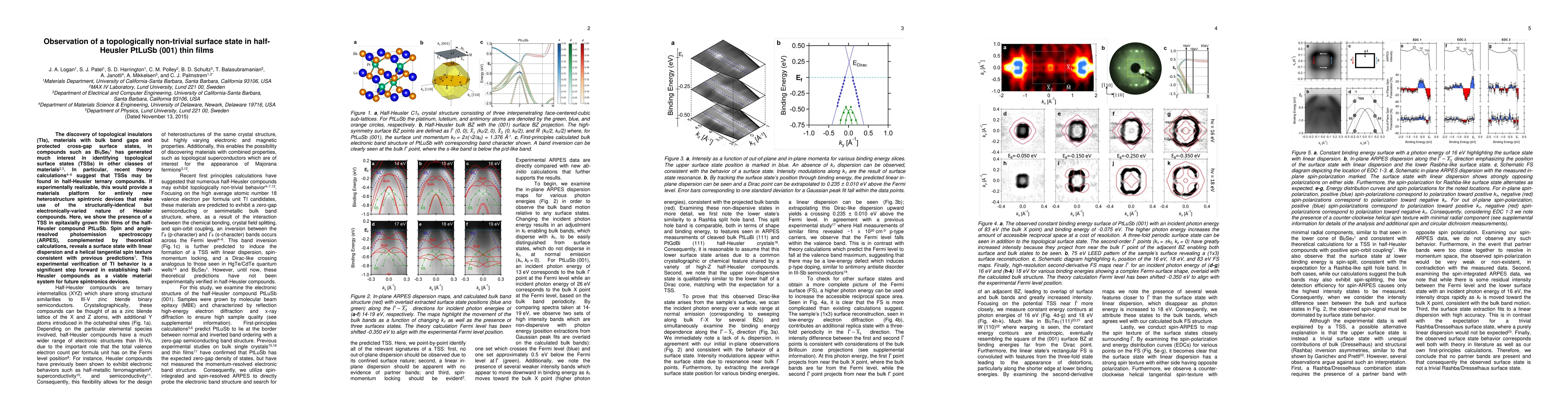 The discovery of topological insulators (TIs), materials with bulk band gaps and protected cross-gap surface states, in compounds such as Bi2Se3 has generated much interest in identifying topological surface states (TSSs) in other classes of materials. In particular, recent theory calculations suggest that TSSs may be found in half-Heusler ternary compounds. If experimentally realizable, this would provide a materials platform for entirely new heterostructure spintronic devices that make use of the structurally-identical but electronically-varied nature of Heusler compounds. Here, we show the presence of a TSS in epitaxially grown thin films of the half-Heusler compound PtLuSb. Spin and angle-resolved photoemission spectroscopy (ARPES), complemented by theoretical calculations, reveals a surface state with linear dispersion and a helical tangential spin texture consistent with previous predictions. This experimental verification of TI behavior is a significant step forward in establishing half-Heusler compounds as a viable material system for future spintronics devices.