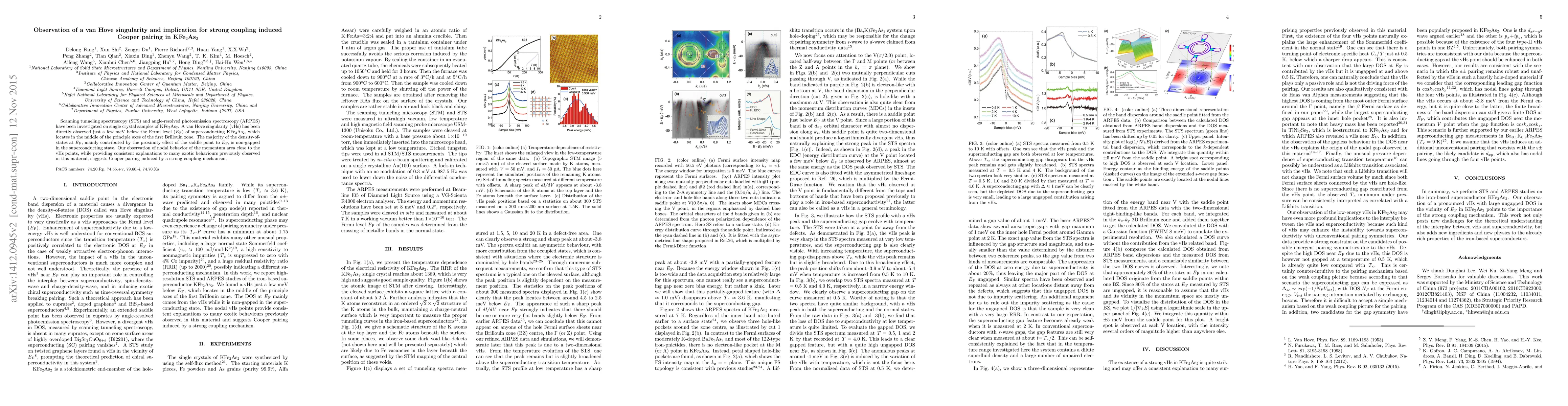 The paper presents direct STS and ARPES observations of a van Hove singularity in KFe2As2, near the Fermi level, implicating strong coupling-induced Cooper pairing. The majority of density-of-states at E_F remains non-gapped, supporting nodal behavior and explaining exotic material properties.