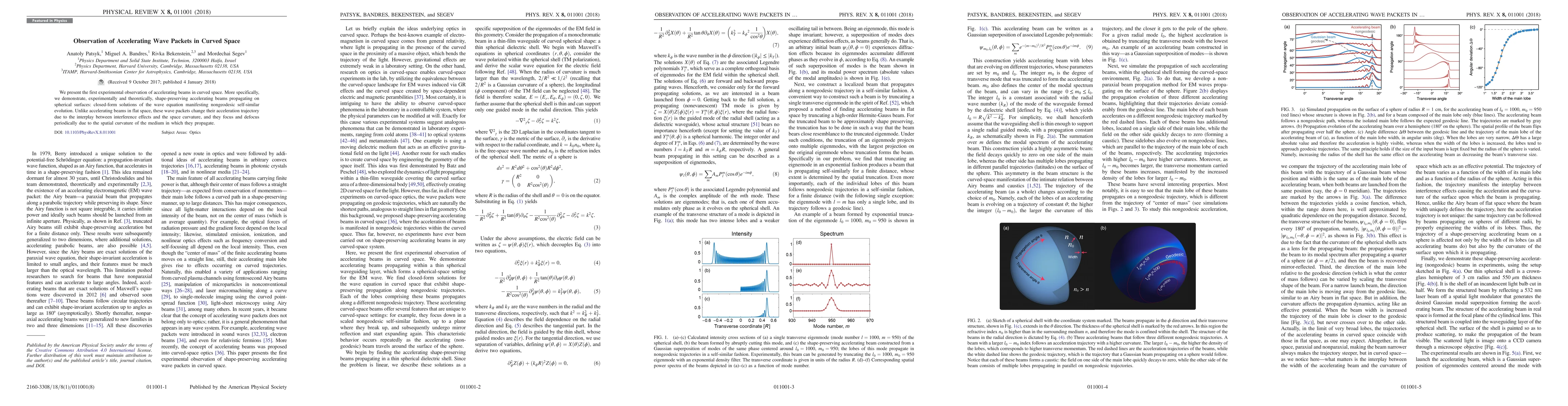 The study reports the first experimental observation of accelerating wave packets in curved space, revealing shape-preserving beams on spherical surfaces that undergo periodic focusing and defocusing due to interference effects and curvature, demonstrating nongeodesic self-similar evolution. This behavior contrasts with beams in flat space, highlighting the influence of spatial curvature on wave propagation.