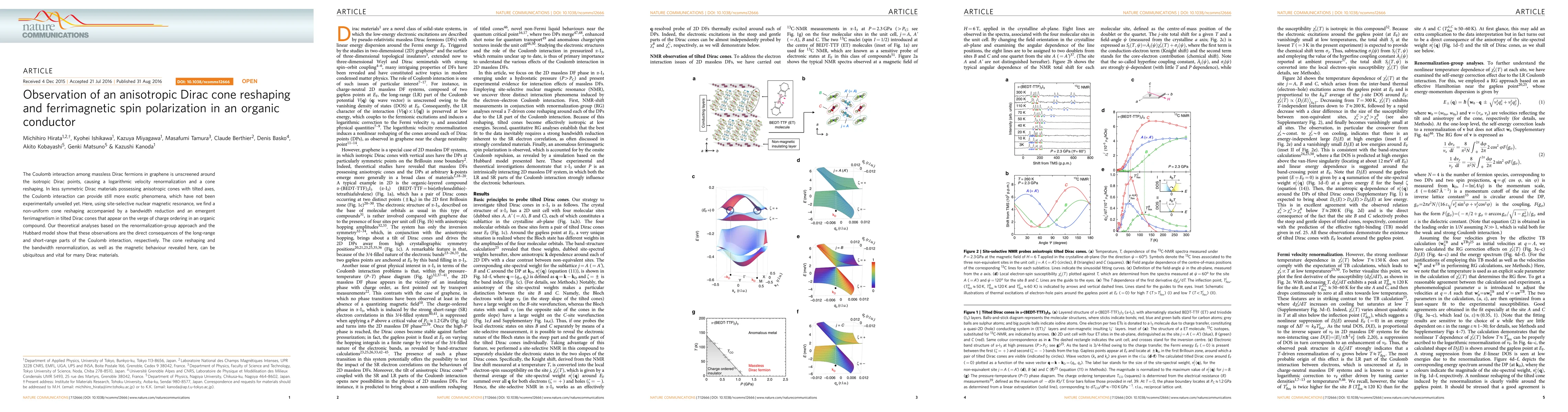 This study reveals anisotropic reshaping of Dirac cones and ferrimagnetic spin polarization in an organic conductor, observed through site-selective nuclear magnetic resonance. Theoretical analyses attribute these phenomena to both long-range and short-range Coulomb interactions, suggesting their significance for understanding Dirac materials.