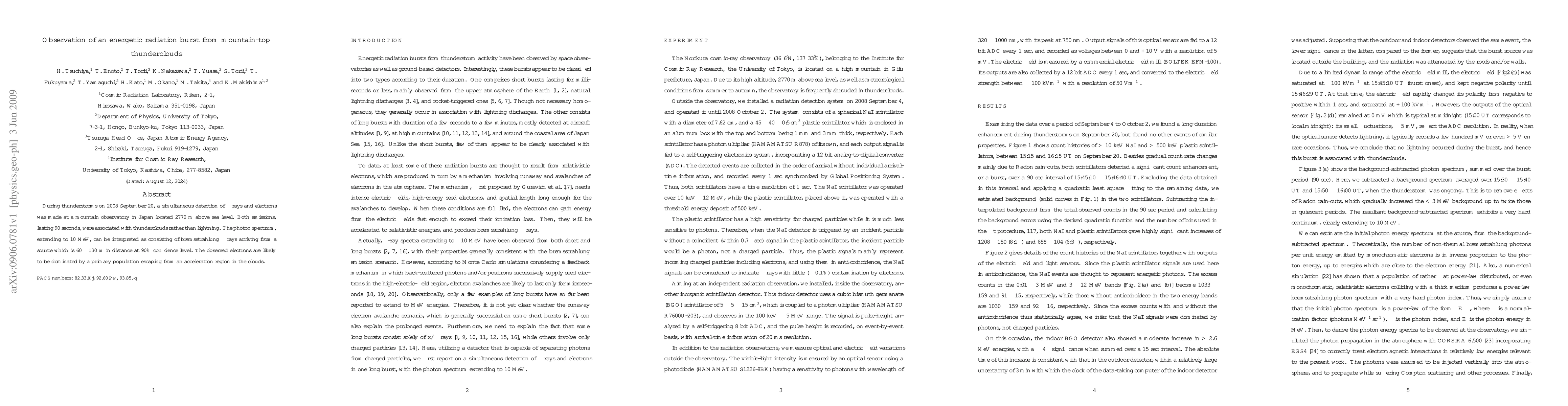 During thunderstorms on 2008 September 20, a simultaneous detection of gamma rays and electrons was made at a mountain observatory in Japan located 2770 m above sea level. Both emissions, lasting 90 seconds, were associated with thunderclouds rather than lightning. The photon spectrum, extending to 10 MeV, can be interpreted as consisting of bremsstrahlung gamma rays arriving from a source which is 60 - 130 m in distance at 90% confidence level. The observed electrons are likely to be dominated by a primary population escaping from an acceleration region in the clouds.