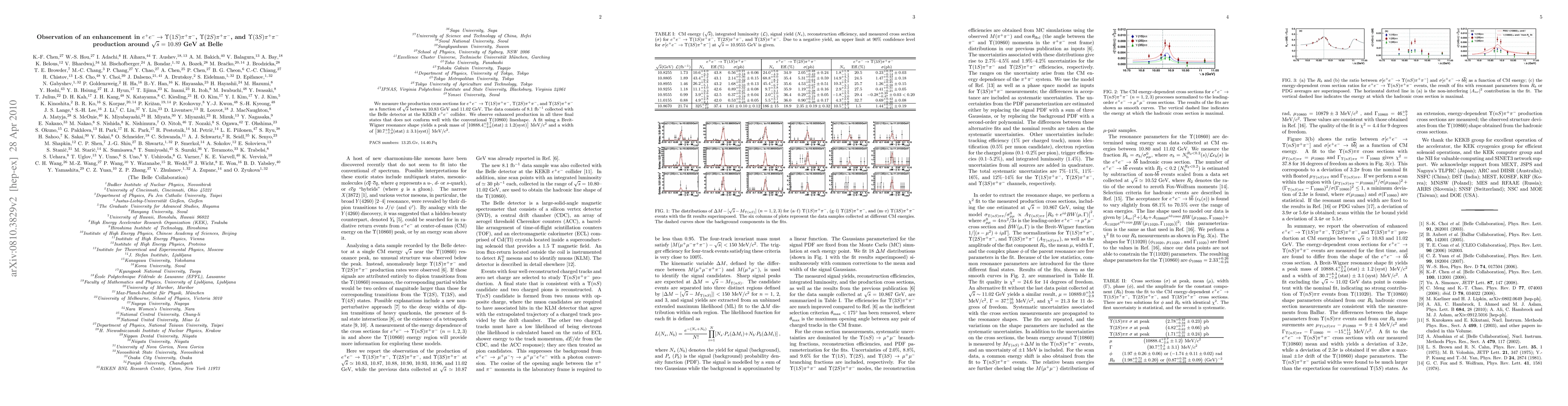 We measure the production cross sections for $e^+e^- \to \Upsilon(1S)\pi^+\pi^-$, $\Upsilon(2S)\pi^+\pi^-$, and $\Upsilon(3S)\pi^+\pi^-$ as a function of $\sqrt{s}$ between 10.83 GeV and 11.02 GeV. The data consists of 8.1 fb$^{-1}$ collected with the Belle detector at the KEKB $e^+e^-$ collider. We observe enhanced production in all three final states that does not conform well with the conventional $\Upsilon(10860)$ lineshape. A fit using a Breit-Wigner resonance shape yields a peak mass of $[10888.4^{+2.7}_{-2.6} ({\rm stat}) \pm1.2 ({\rm syst})]$ MeV/$c^2$ and a width of $[30.7_{-7.0}^{+8.3} ({\rm stat}) \pm3.1 ({\rm syst})]$ MeV/$c^2$.
