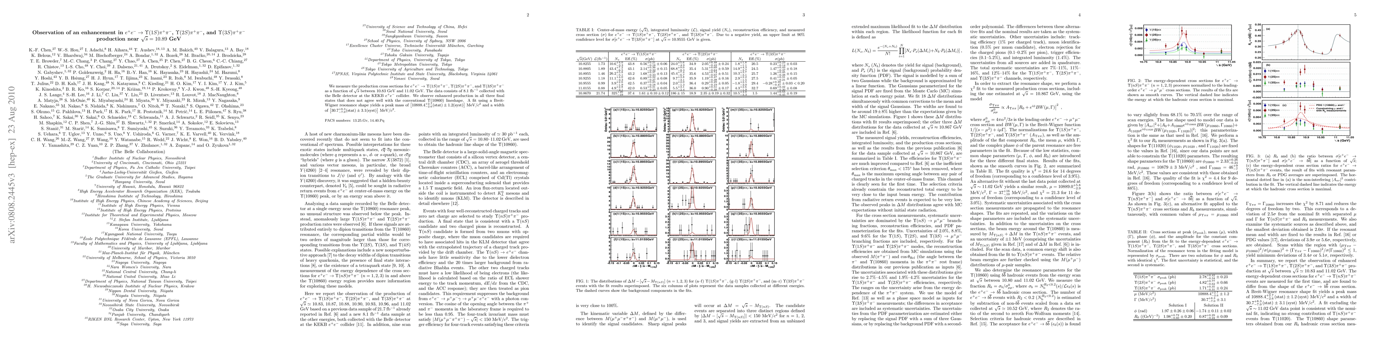 Researchers at Belle observed enhanced production of Upsilon(1S)pi+pi-, Upsilon(2S)pi+pi-, and Upsilon(3S)pi+pi- near a sqrt{s}=10.89 GeV energy, contradicting conventional lineshapes.