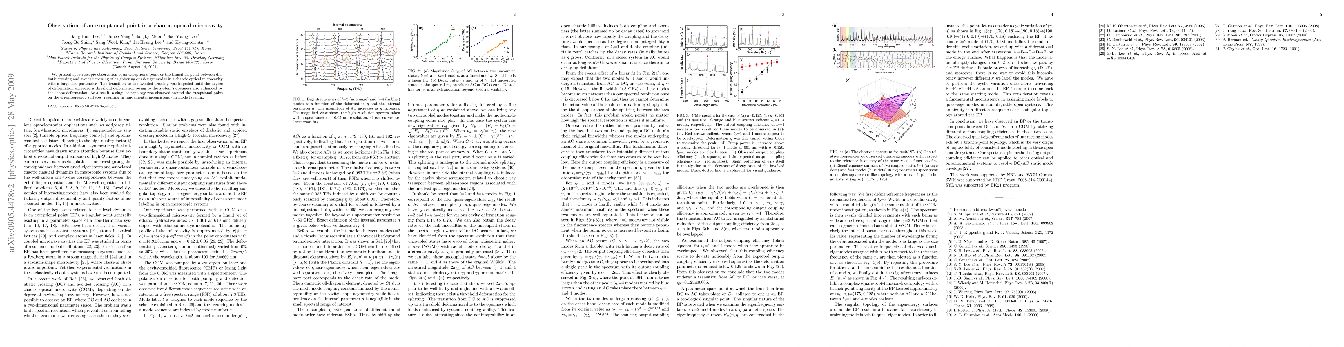 This paper reports the spectroscopic observation of an exceptional point in a chaotic optical microcavity, where the transition from diabatic crossing to avoided crossing of quasi-eigenmodes occurs when the degree of deformation surpasses a critical threshold, revealing a singular topology and fundamental mode labeling inconsistencies.