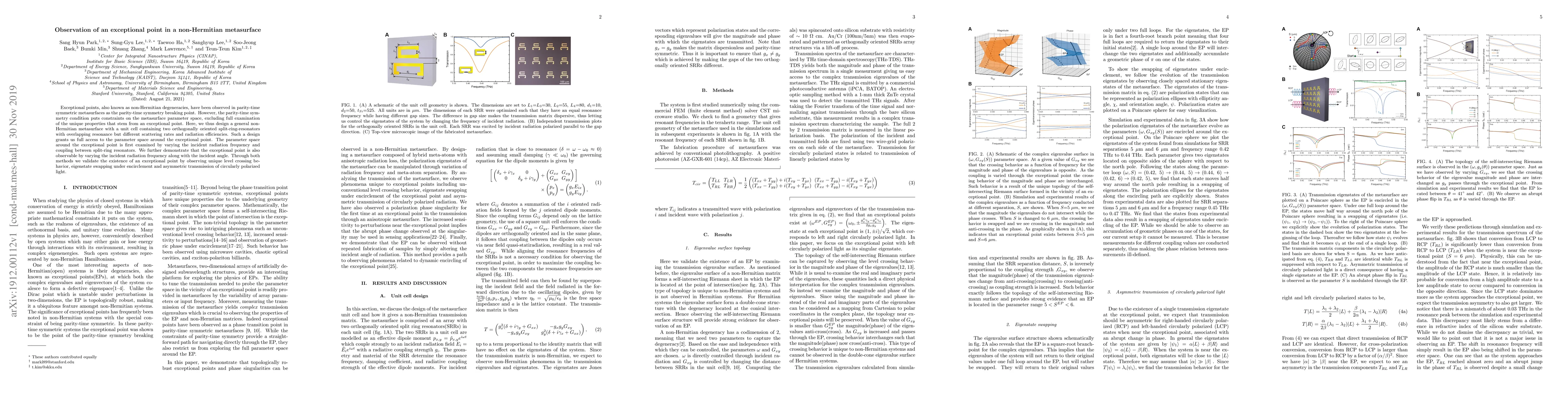 This paper observes an exceptional point in a non-Hermitian metasurface composed of two orthogonally split-ring resonators, allowing full exploration of its unique properties. The study validates the exceptional point through frequency and angle variations, demonstrating unique level crossing behavior, eigenstate swapping, and asymmetric transmission of circularly polarized light.
