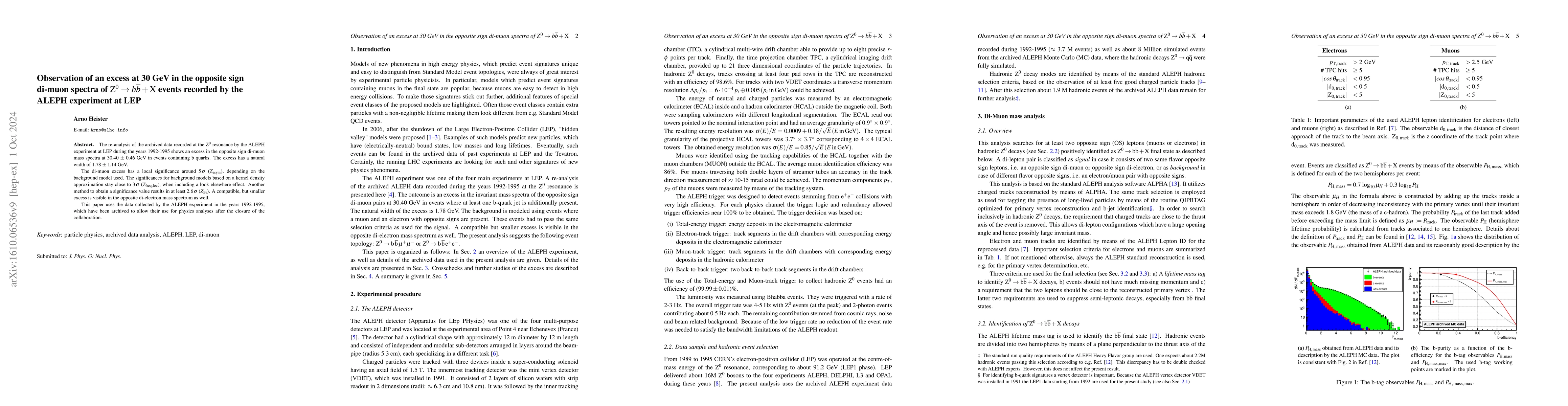 The re-analysis of the archived data recorded at the ${\rm Z}^{0}$ resonance by the ALEPH experiment at LEP during the years 1992-1995 shows an excess in the opposite sign di-muon mass spectra at 30.40 $\pm$ 0.46 GeV in events containing b quarks. The excess has a natural width of 1.78 $\pm$ 1.14 GeV. The di-muon excess has a local significance around $5\,\sigma$ ($Z_{\rm asym}$), depending on the background model used. The significances for background models based on a kernel density approximation stay close to $3\,\sigma$ ($Z_{\rm freq,\,lee}$), when including a look elsewhere effect. Another method to obtain a significance value results in at least $2.6\,\sigma$ ($Z_{\rm Bi}$). A compatible, but smaller excess is visible in the opposite di-electron mass spectrum as well. This paper uses the data collected by the ALEPH experiment in the years 1992-1995, which have been archived to allow their use for physics analyses after the closure of the collaboration.