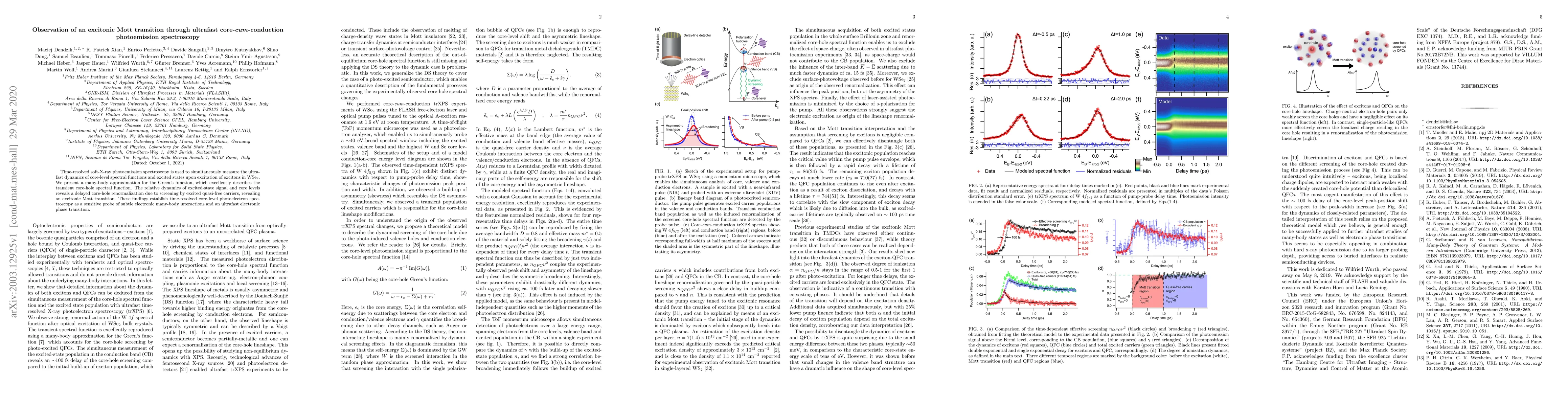 Time-resolved soft-X-ray photoemission spectroscopy is used to simultaneously measure the ultrafast dynamics of core-level spectral functions and excited states upon excitation of excitons in WSe$_2$. We present a many-body approximation for the Green's function, which excellently describes the transient core-hole spectral function. The relative dynamics of excited-state signal and core levels reveals a delayed core-hole renormalization due to screening by excited quasi-free carriers, revealing an excitonic Mott transition. These findings establish time-resolved core-level photoelectron spectroscopy as a sensitive probe of subtle electronic many-body interactions and an ultrafast electronic phase transition.