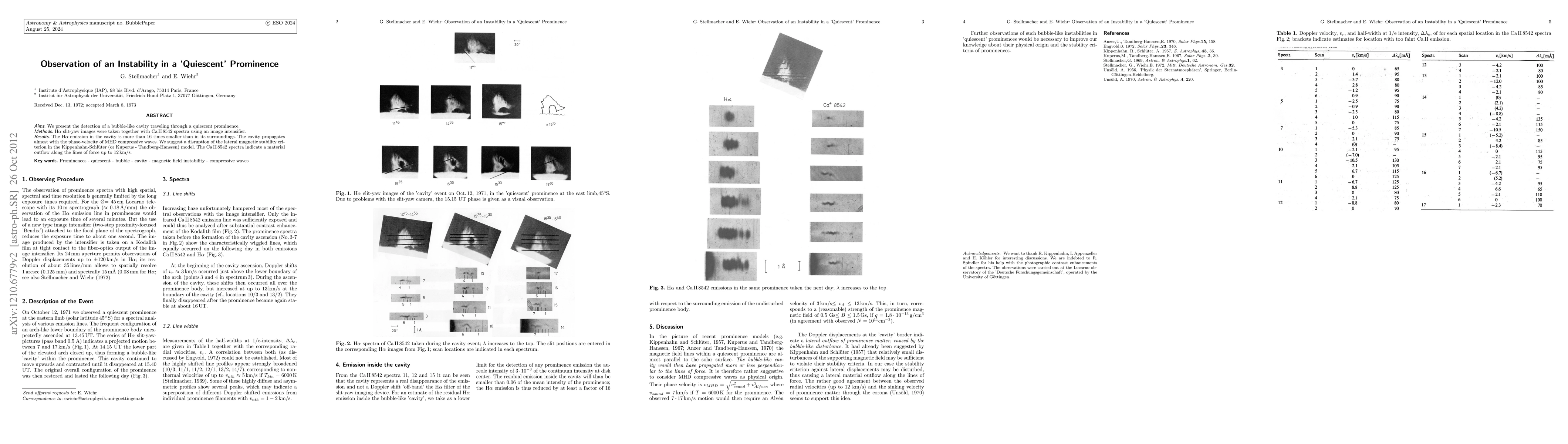 We present the detection of a bubble-like cavity traveling through a quiescent prominence. The H-alpha emission in the cavity is >16 times smaller than in its surroundings. The cavity propagates almost with the phase-velocity of MHD compressive waves. We suggest a disruption of the lateral magnetic stability. The Ca II 8542 spectra indicate a material outflow along the lines of force up to 12 km/s.