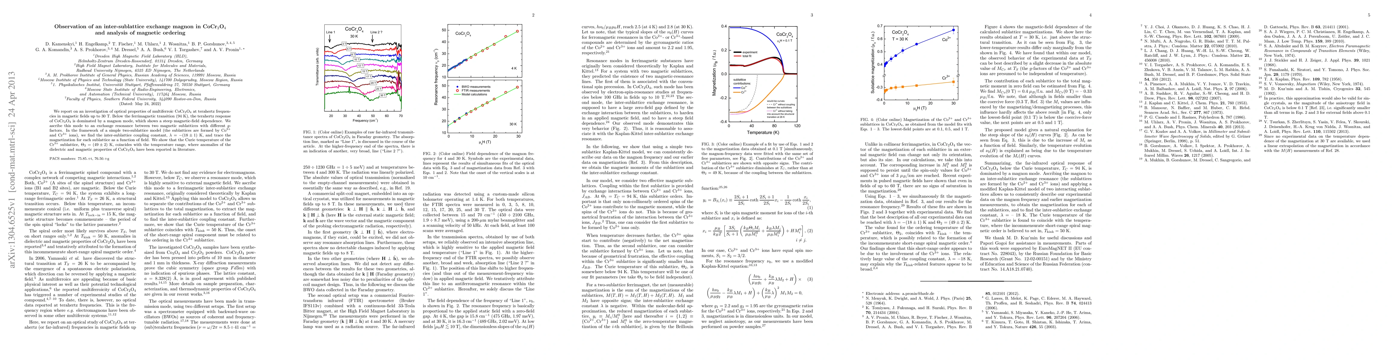 We report on an investigation of optical properties of multiferroic CoCr$_{2}$O$_{4}$ at terahertz frequencies in magnetic fields up to 30 T. Below the ferrimagnetic transition (94 K), the terahertz response of CoCr$_{2}$O$_{4}$ is dominated by a magnon mode, which shows a steep magnetic-field dependence. We ascribe this mode to an exchange resonance between two magnetic sublattices with different $g$-factors. In the framework of a simple two-sublattice model (the sublattices are formed by Co$^{2+}$ and Cr$^{3+}$ ions), we find the inter-sublattice coupling constant, $\lambda = - (18 \pm 1)$ K, and trace the magnetization for each sublattice as a function of field. We show that the Curie temperature of the Cr$^{3+}$ sublattice, $\Theta_{2}$ = $(49 \pm 2)$ K, coincides with the temperature range, where anomalies of the dielectric and magnetic properties of CoCr$_{2}$O$_{4}$ have been reported in literature.
