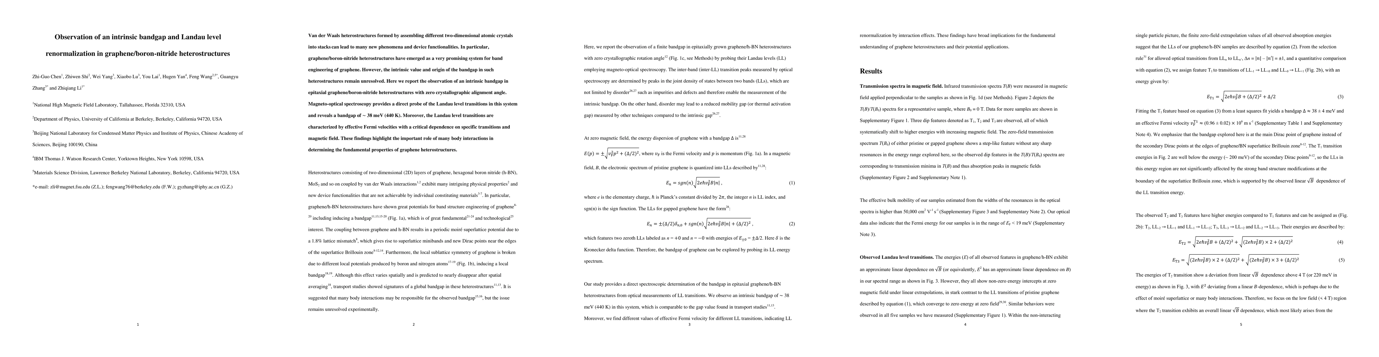 This study observes an intrinsic bandgap of ~38 meV in graphene/boron-nitride heterostructures using magneto-optical spectroscopy, revealing significant Landau level renormalization influenced by many-body interactions.