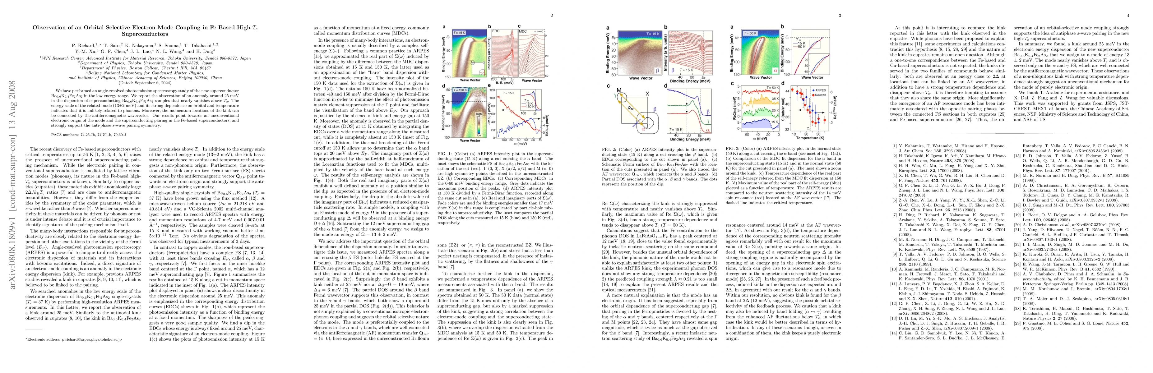 We have performed an angle-resolved photoemission spectroscopy study of the new superconductor Ba$_{0.6}$K$_{0.4}$Fe$_2$As$_2$ in the low energy range. We report the observation of an anomaly around 25 meV in the dispersion of superconducting Ba$_{0.6}$K$_{0.4}$Fe$_2$As$_2$ samples that nearly vanishes above $T_c$. The energy scale of the related mode (13$\pm$2 meV) and its strong dependence on orbital and temperature indicates that it is unlikely related to phonons. Moreover, the momentum locations of the kink can be connected by the antiferromagnetic wavevector. Our results point towards an unconventional electronic origin of the mode and the superconducting pairing in the Fe-based superconductors, and strongly support the anti-phase s-wave pairing symmetry.